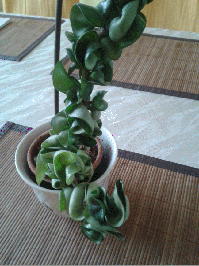 Die Pflanze ist dickblättrig und hat geschwungene Blätter. Außerdem hat sie bei mir noch nie geblüht. Sie verzweigt sich auch nicht.