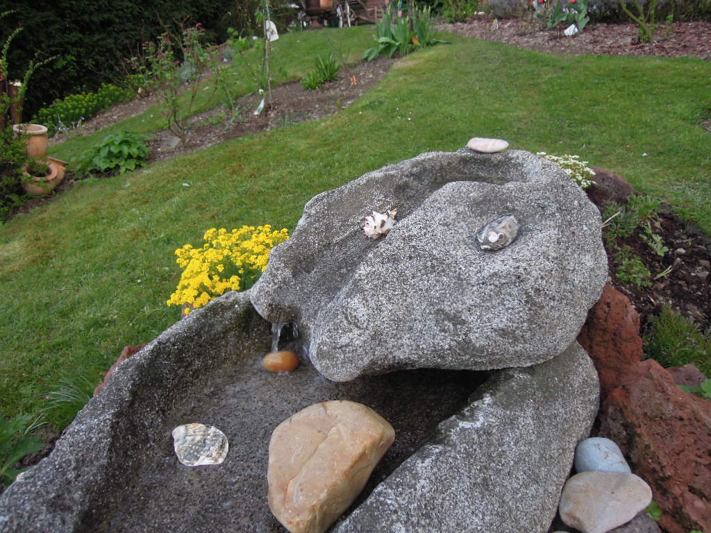 Und das ist das Ergebnis dessen, die Natursteine habe ich gebraucht gekauft, ebenso das Teichbecken für die Pumpe und dank der Hilfe meiner Nachbarn und meines Sohnes habe ich wieder ein kleines Stückchen Gartenglück mehr.