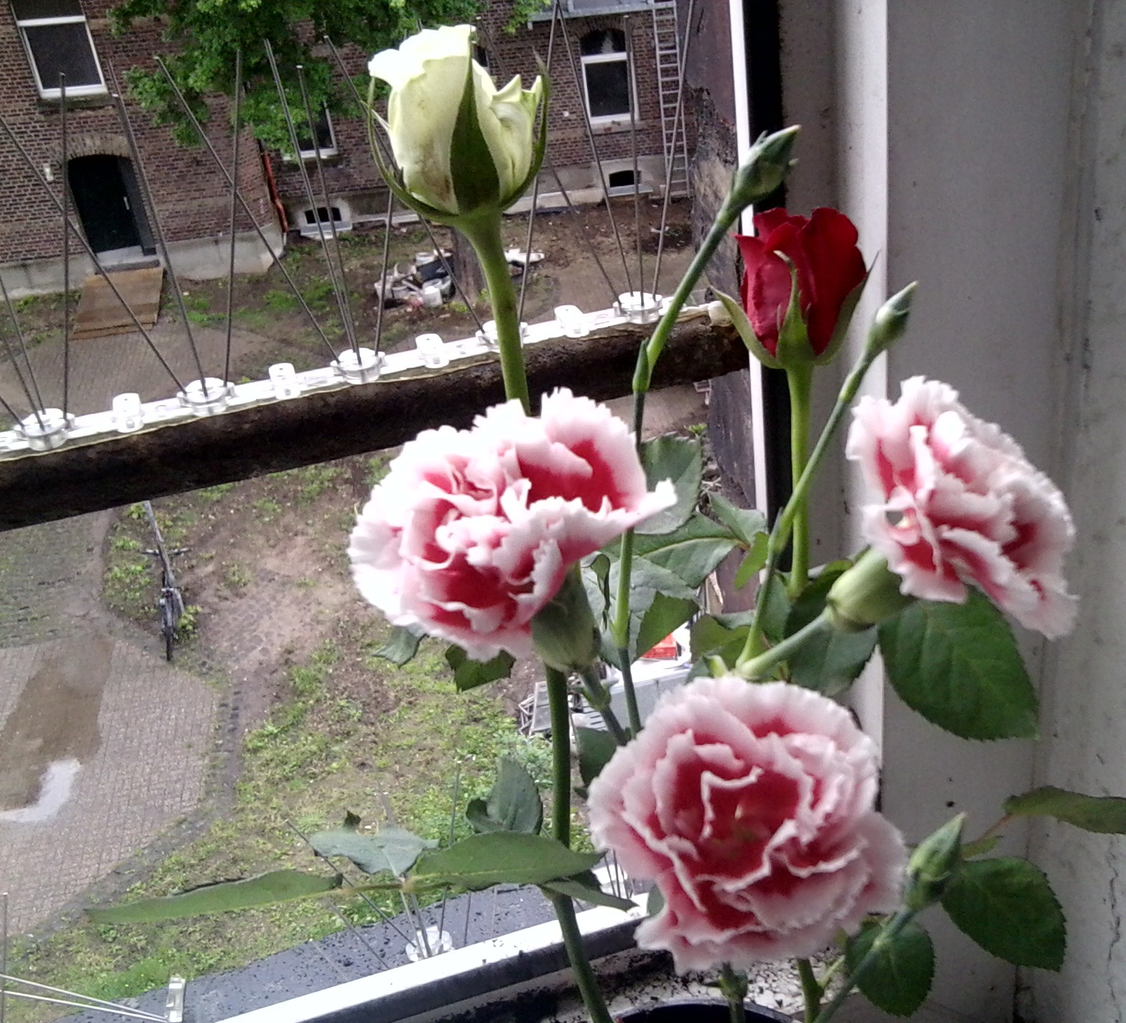 Zuerst mal eine Vorerzählung: Vorgestern hatte meine Mutter Geburtstag. Natürlich hatte sie einen Strauß Blumen gekriegt (Ehrlich gesagt: drei). Eine Blumenart die ich nicht kenne, weiße Rosen und rote Rosen. Ich hab meine Mutter gefragt warum wir nicht Rosen im als Topfpflanze halten können und sie hat gesagt, weil wir kein Balkon, geschweige denn einen Garten haben.
