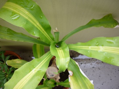 scheint kraftlos zu sein. Sind dir die weissen Flecke aufgefallen. könnte ein Schädling sein, der der Pflanze den Saft und damit die Kraft entzieht.