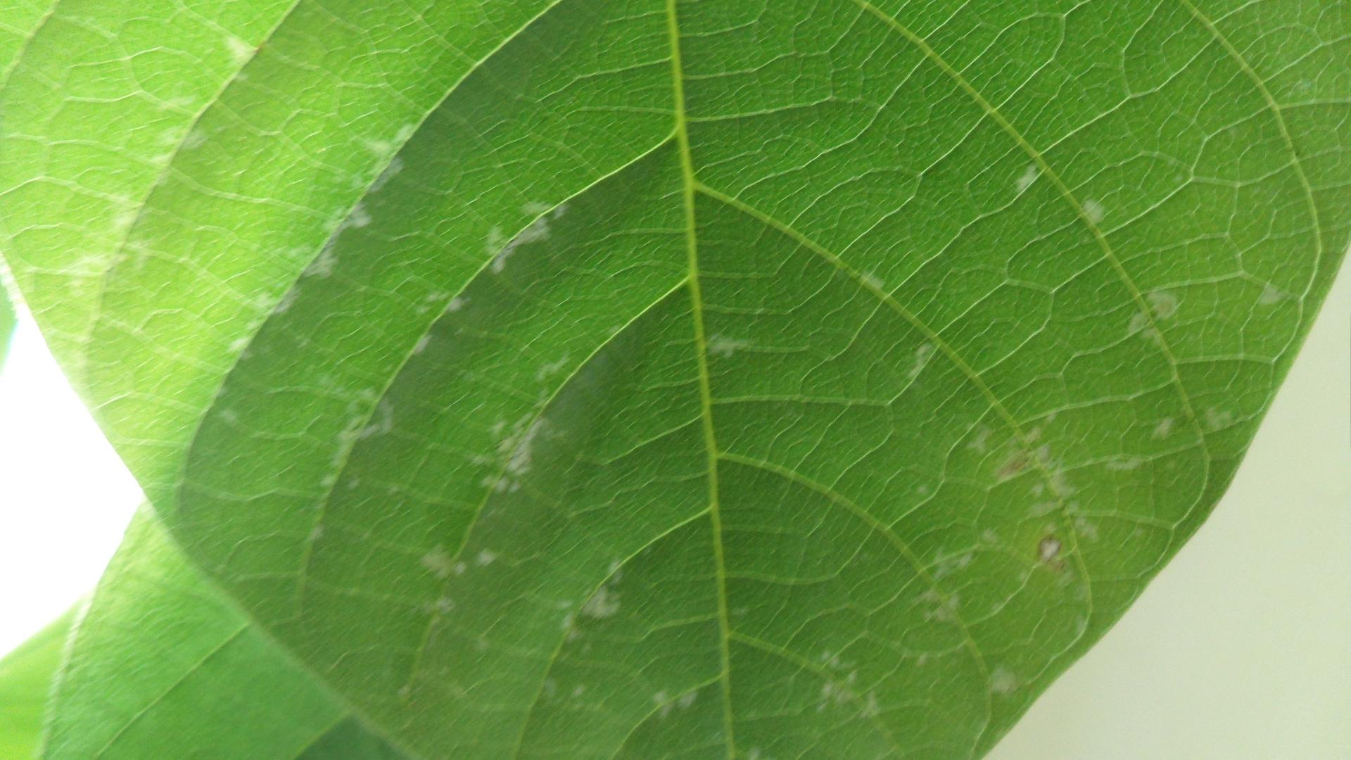 2. Das zweite Problem ist dass ein paar Blätter von meiner Cherimoya pergament artige Flecken bekommen. Ich nehme an dass es ein Schädling ist da es immer mehr wird. (siehe Bild 3 )