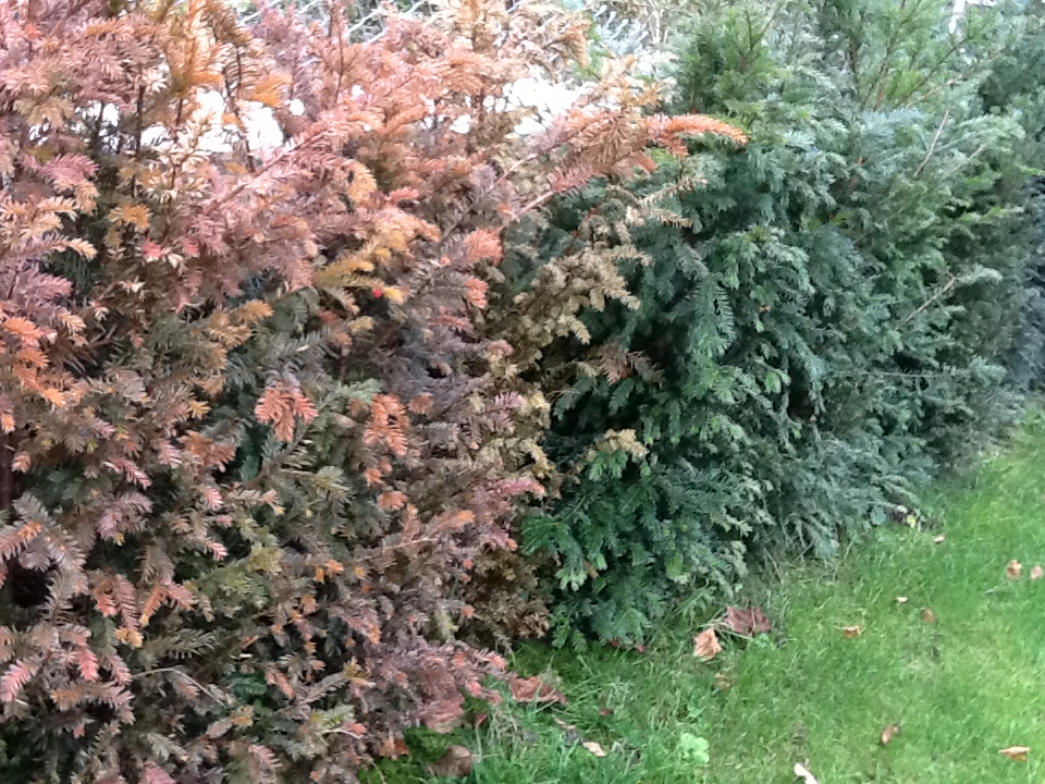 Diese gelb-brau Färbung betrifft nur einige Exemplare, die restliche Hecke ist grün.
