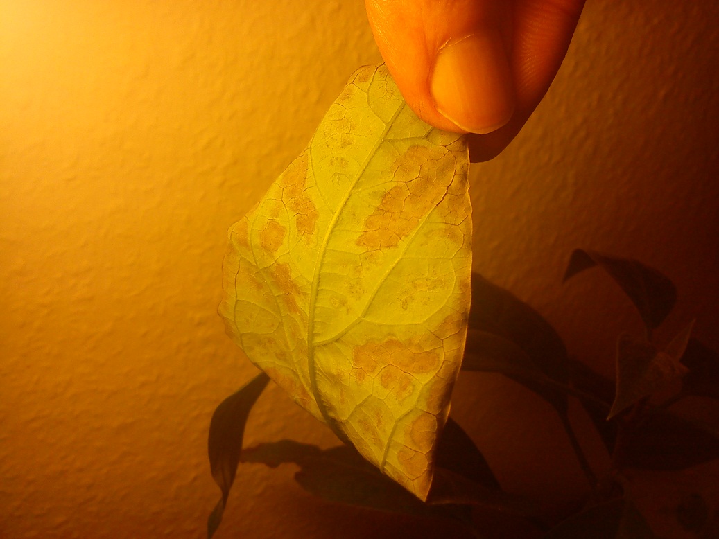 Zuerst kommen die Flecken in den Aderzwischenräumen, erst dann trocknet das Blatt vom Rand her ab...