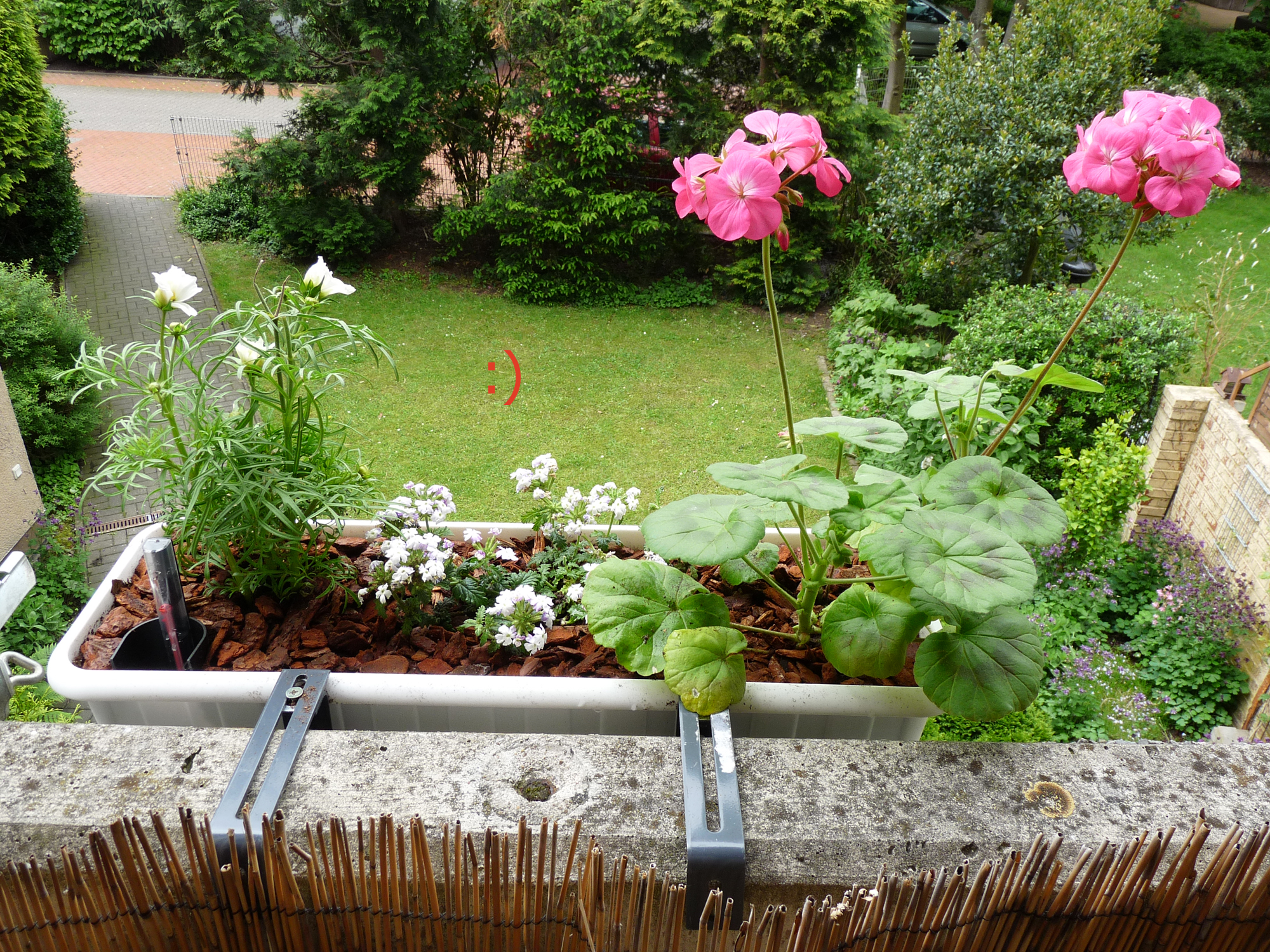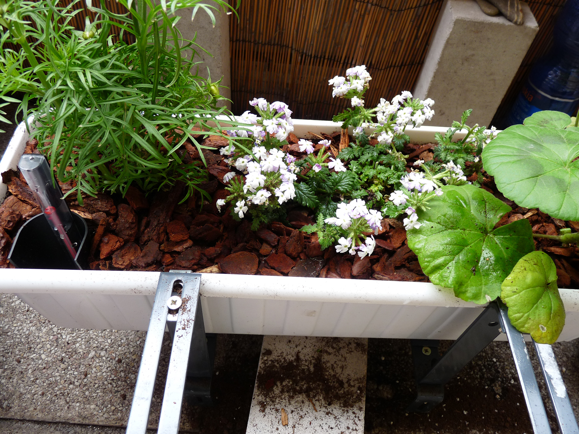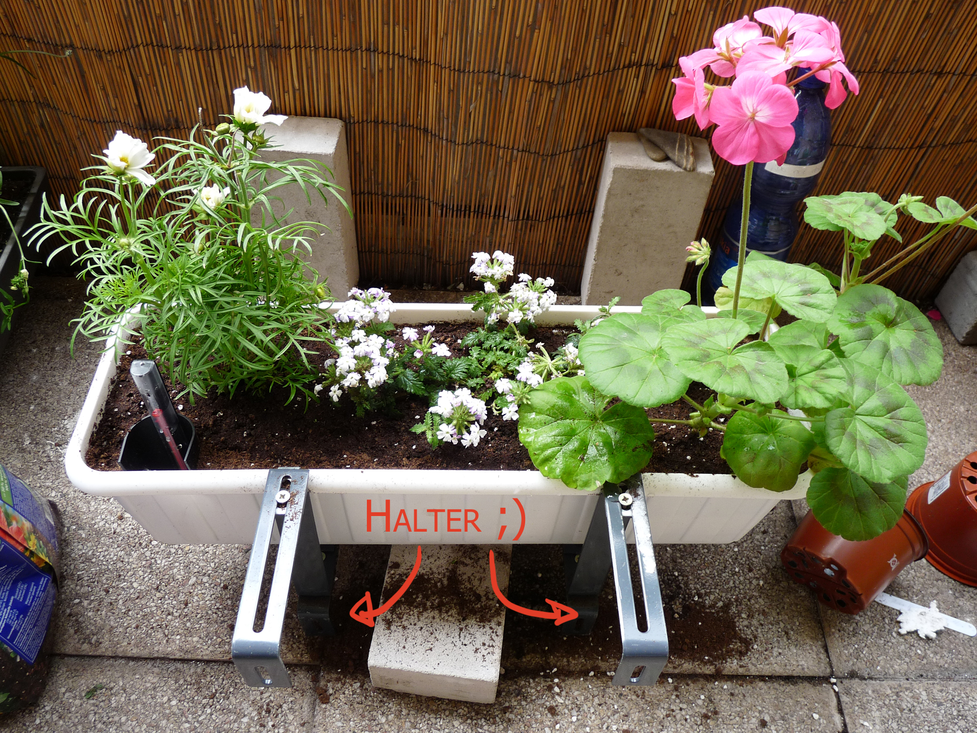 Verwendete Pflanzen: vlnr. Kosmee (ja, ich weis, ist eine große Staude. Vielleicht bleibt sie ja klein...), Hängeverbene, Pelargoniensteckling von September