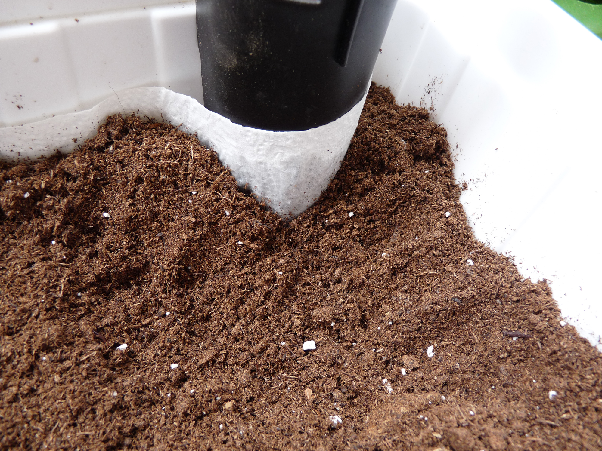 7. Die Trichter mit nicht zu feinem aber saugstarkem Substrat füllen. Ebenso den Rest des Kastens befüllen. Darauf achten, dass kein Substrat in die Zwischenräume von Kasten und Papier fällt.