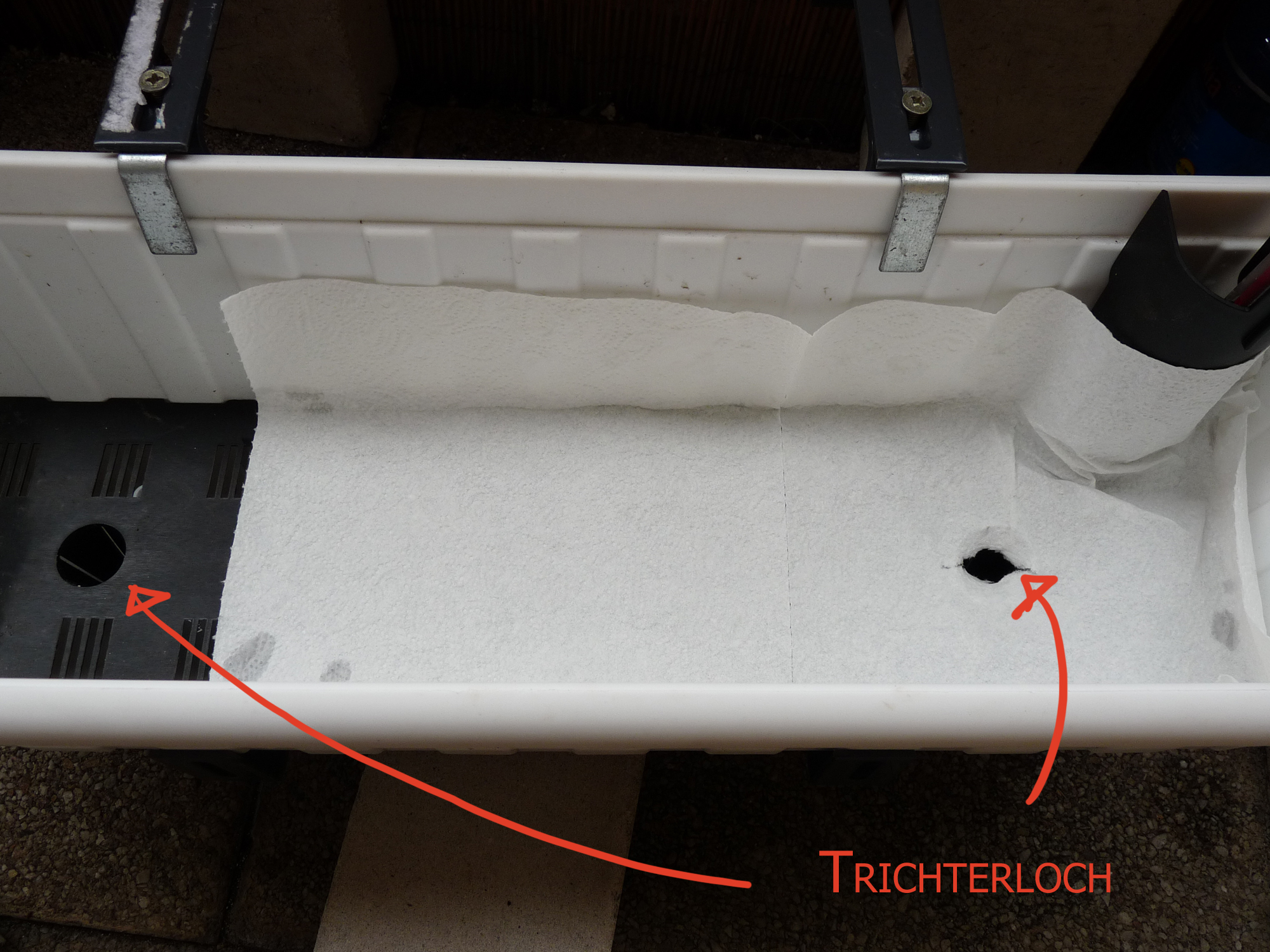2. Am Geländer überprüfen und etwas Wasser einfüllen um den Kasten richtig ausrichten zu können. Entsprechend die unteren Schienen verändern.