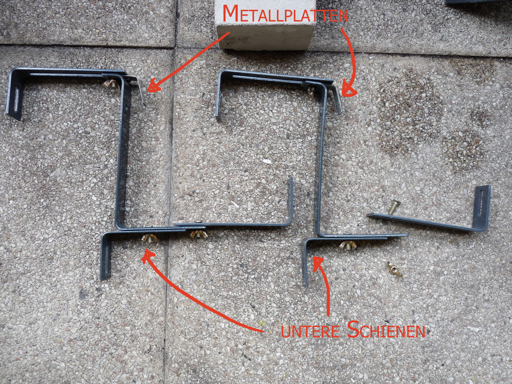 1. Die Halter zusammensetzen und auf den Kasten anpassen. Der Kasten wird zwischen Halter und Metallplatte geklemmt.