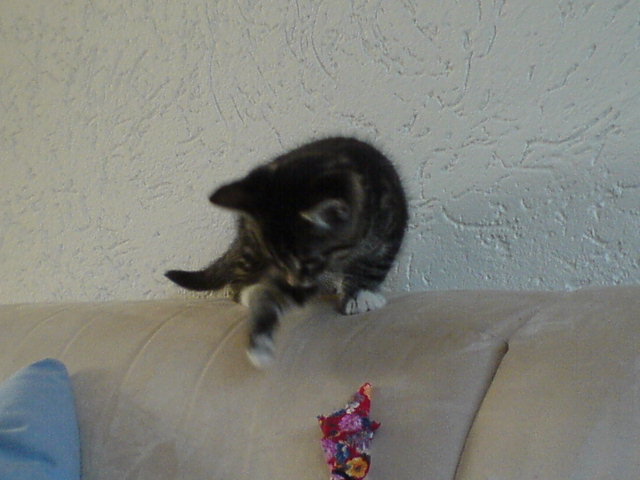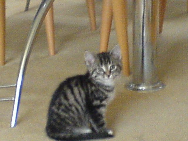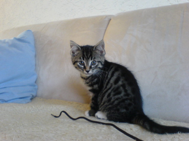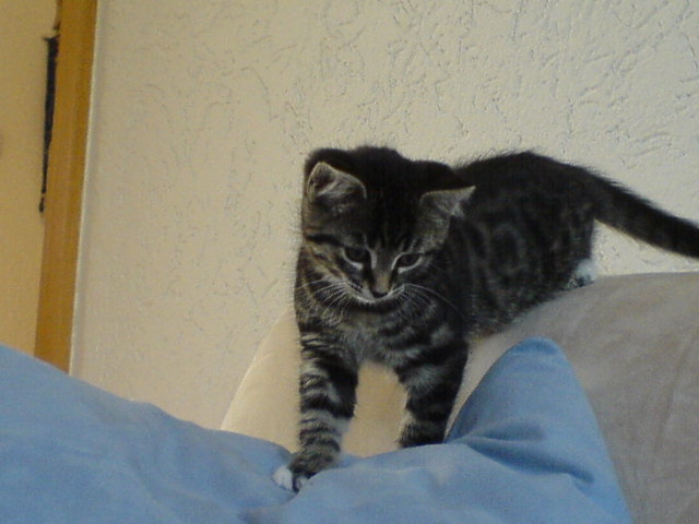 Anfassen find ich erst mal doof, spielen ist aber ok. aber nicht mehr bitteschön... die zwei neuen Katzen sind auch doof, da geh ich lieber unter die Couch, die zwei Menschen bespaßen mich schon recht ordentlich... aber wie gesagt, streicheln solln die mal jemand anderen... aber nicht mich.... obwohl... die erste Nacht hatte ich ja doch ein bisschen Angst und als die dann geschlafen haben, bin ich einfach da hoch in das große, weiche Bett... hmmmm. war das schööööön... so ganz allein mag ich nicht im Zimmer sein... dann schrei ich nach meiner Mama.. die ja jetzt nicht mehr bei mir ist... aber ich werd das schon schaffen, ich bin ja schon sooo groß(schnief, schluchz), ich bin doch schließlich schon 8 Wochen alt... da kann mich doch nichts erschüttern....