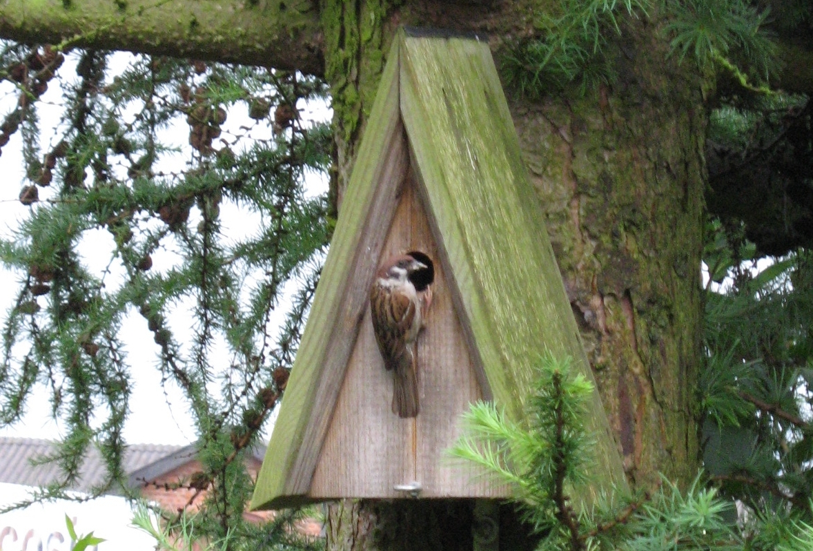 Aber jetzt, wo die Kleinen geschlüpft sind und dauernd nach Futter schreien, sind die Eltern endlich zu sehen. So wie ich das sehe, sind das Feldsperlinge, die "möblierte Apartements" bevorzugen.