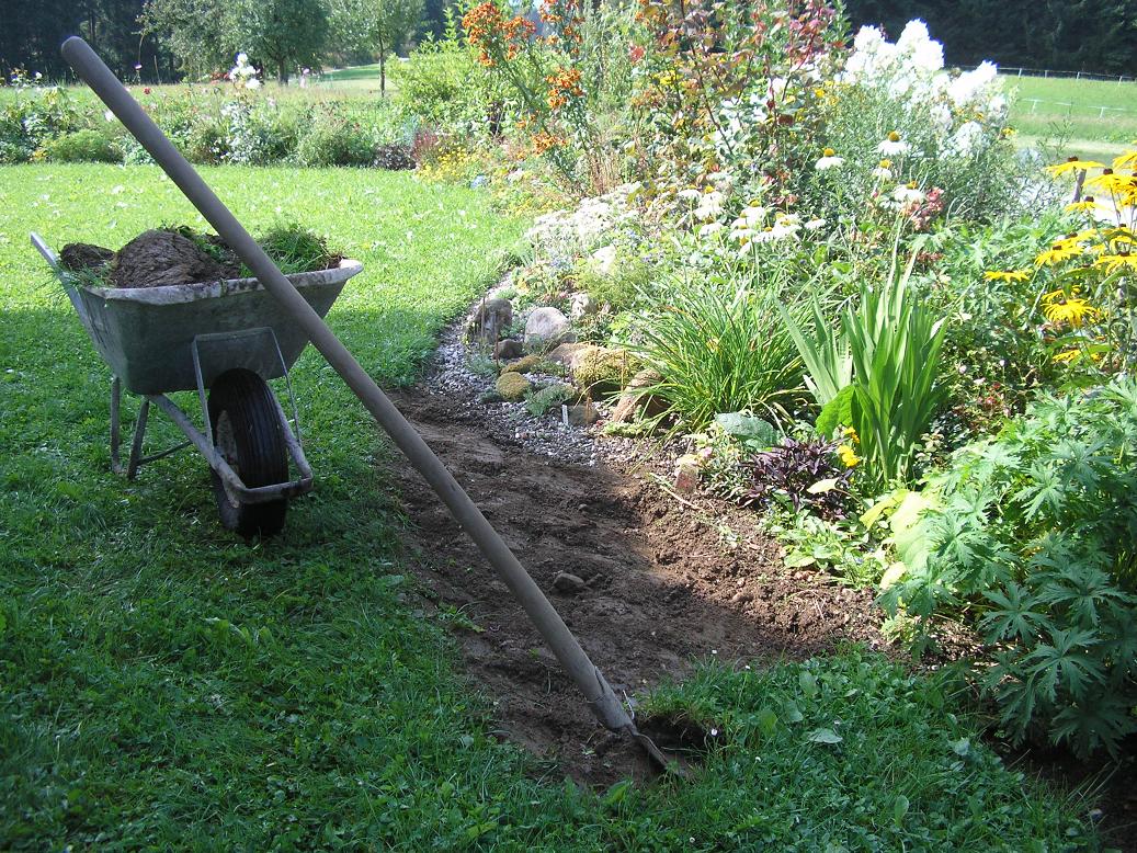 Nach dem Weg habe ich dann noch mal eine Schubkarre voller Sand und Kies herangekarrt und mit diesem material dann die oberste Schicht des Steingartens abgedeckt und das ganze dann nur grob mit der Erde gemischt. (Unten drinnen ist ja genug Erde) Außerdem kommen nun die ganzen Steine an die Reihe die alle eingebaut werden müssen, in kleinen oder größeren Gruppen, wie man will.