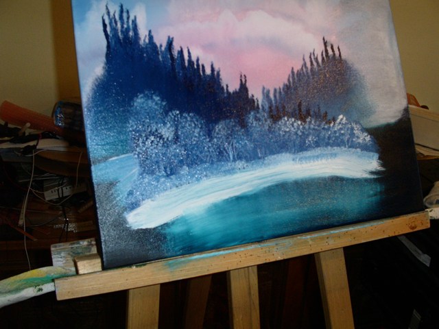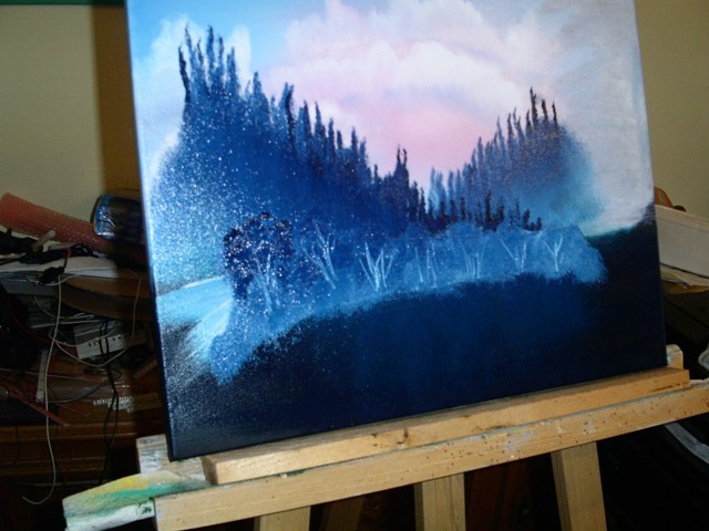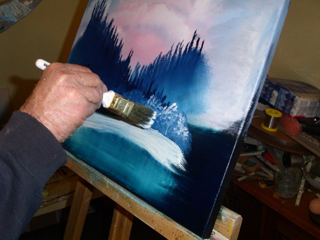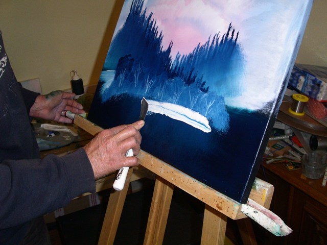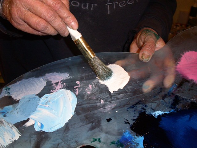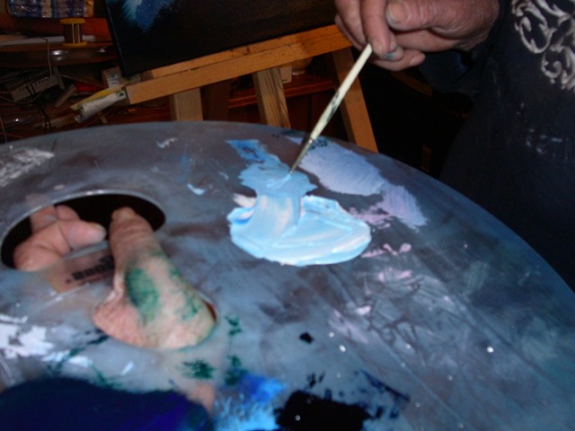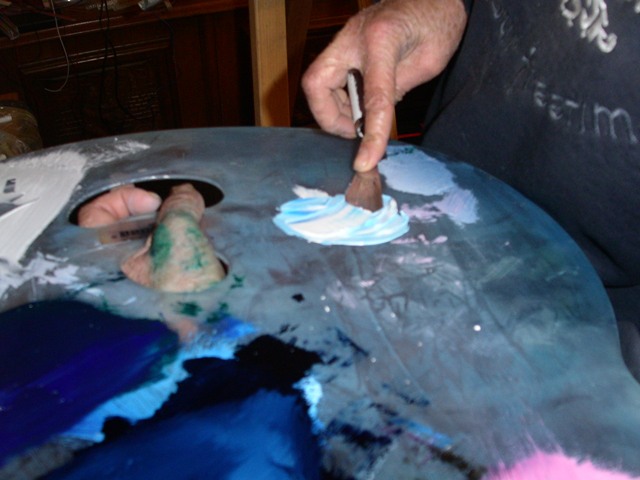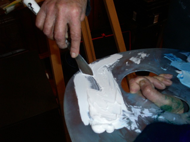 Dazu nehmen wir mit dem Messer Farbe auf. In diesem Fall Titanweiss und Phthaloblau.