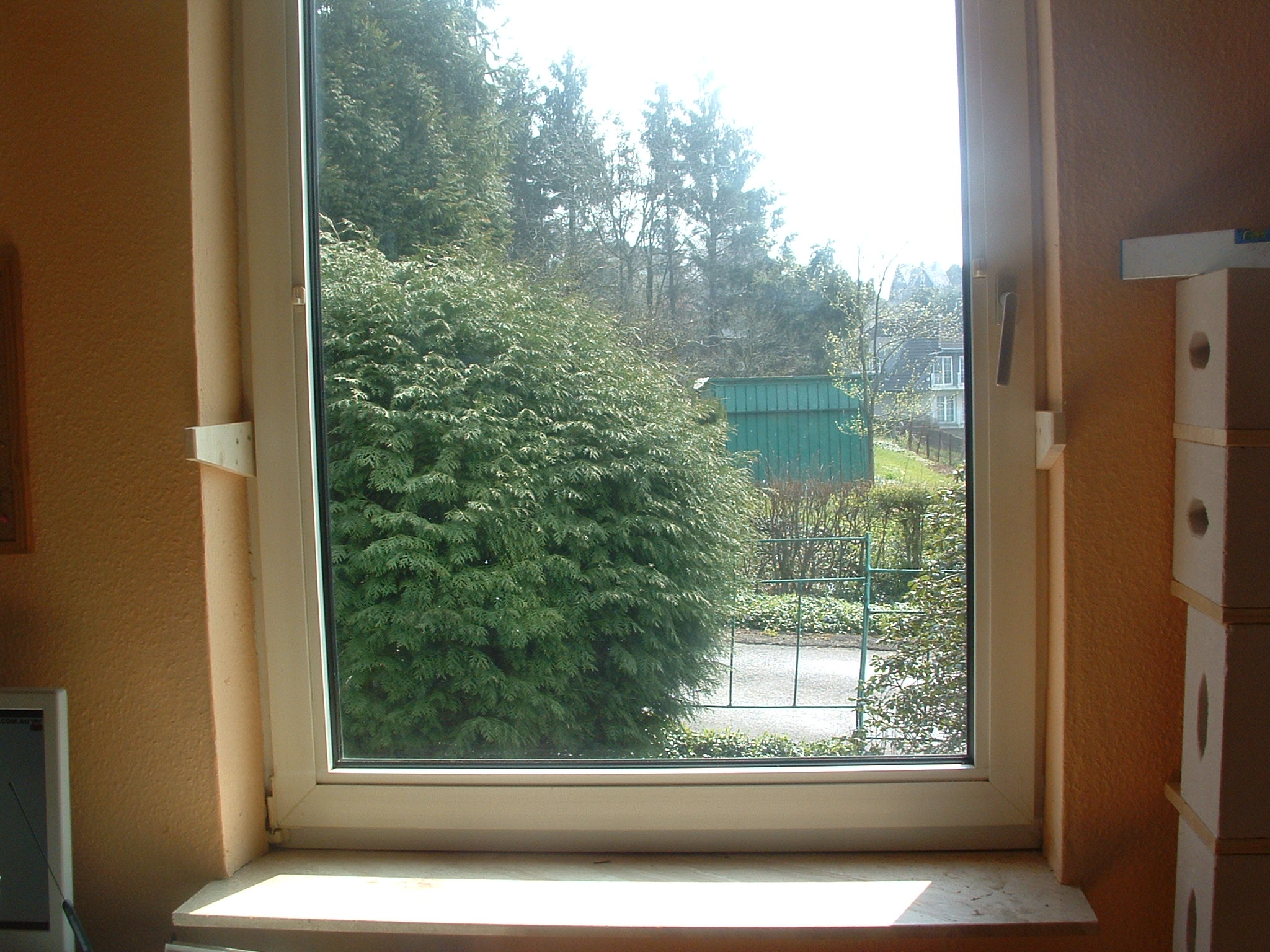 Auf Kipp läßt sich das Fenster problemlos öffnen, zum ganz öffnen müßte ich das Brett losschrauben. Putz' ich es halt von außen...