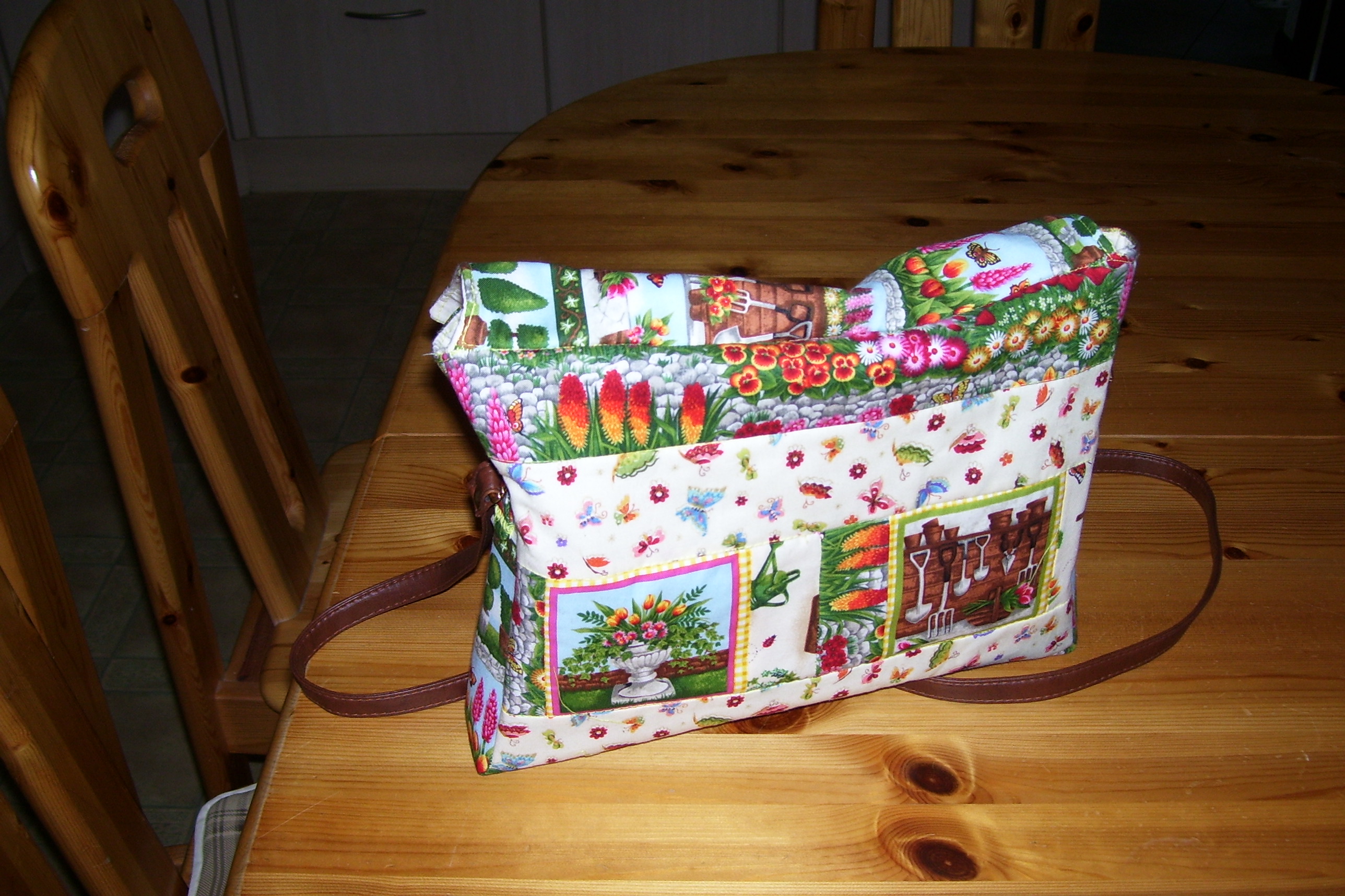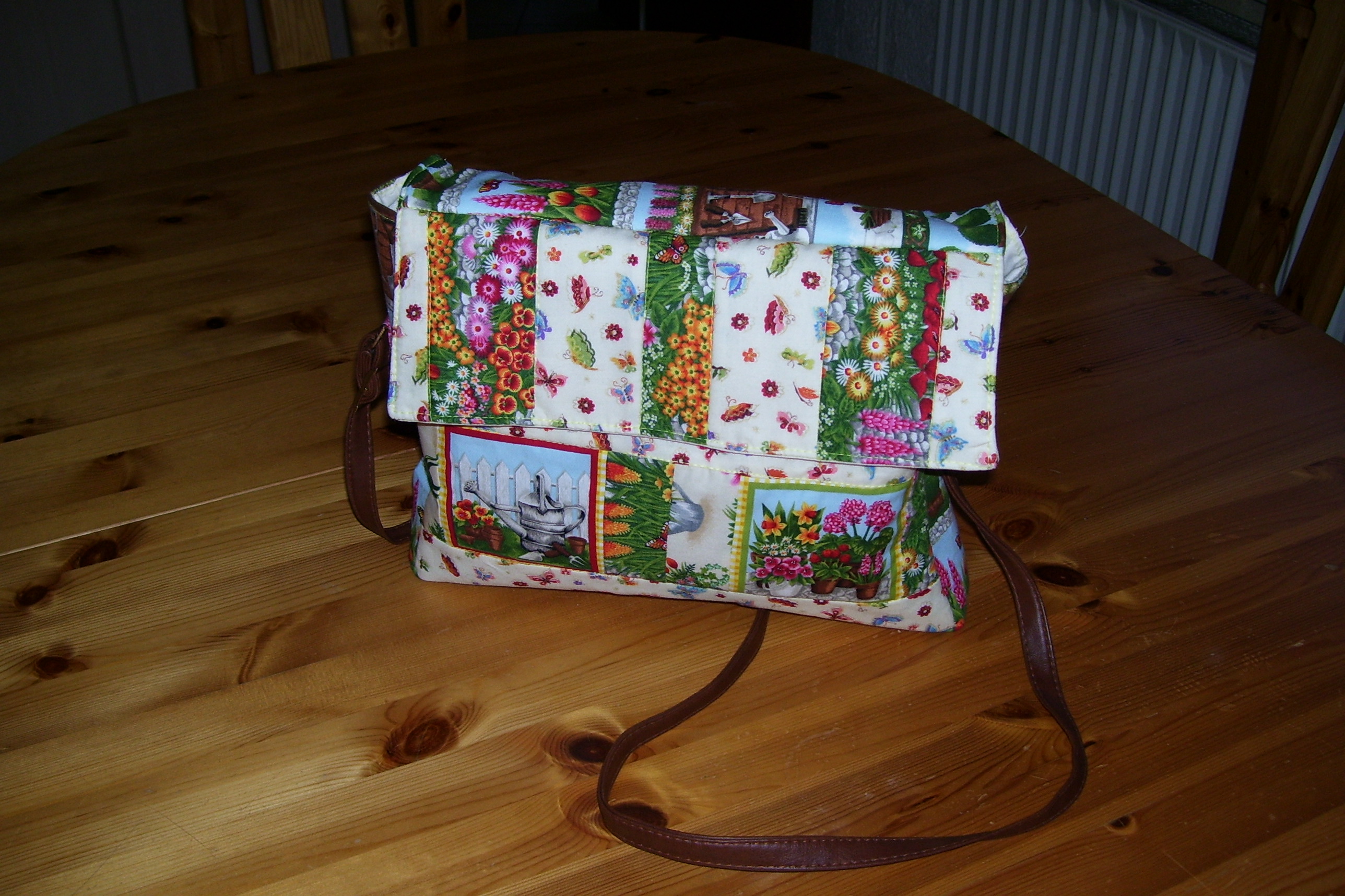 Ich fand den Patchwork-Stoff genial und meine Mutter hatte dann die Idee, mir zum Treffen dieses kleine Täschen zu entwerfen....im Innenraum befinden sich kleine Taschen für Portemonnaie, Handy und ???