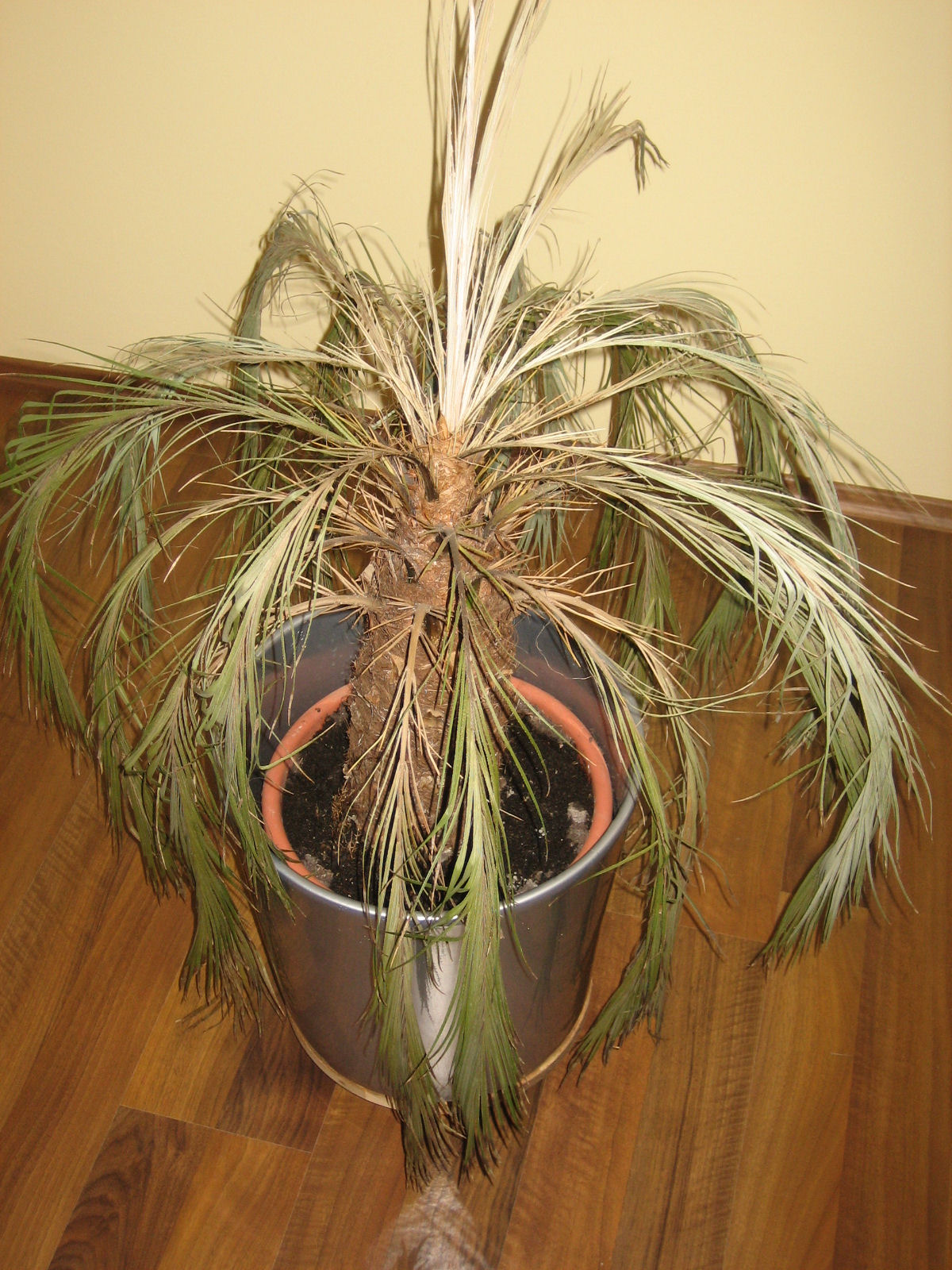 Wie auf dem Foto ersichtlich ist, lässt die Palme die Blätter nur noch runter hängen. Was kann die Ursache dafür sein?