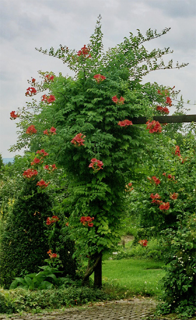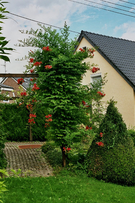 wir haben den an einer 5m hohen südwand, und bis er da hochgeklettert war, hat er die ersten 4 jahre nur äusserst sporadisch mal geblüht, aber als er dann die dachkante erreichte und von da an jedes jahr kräftig zurückgeschnitten werden musste, damit er nicht unters dach wächst, von da an blühte er jedes jahr üppiger!