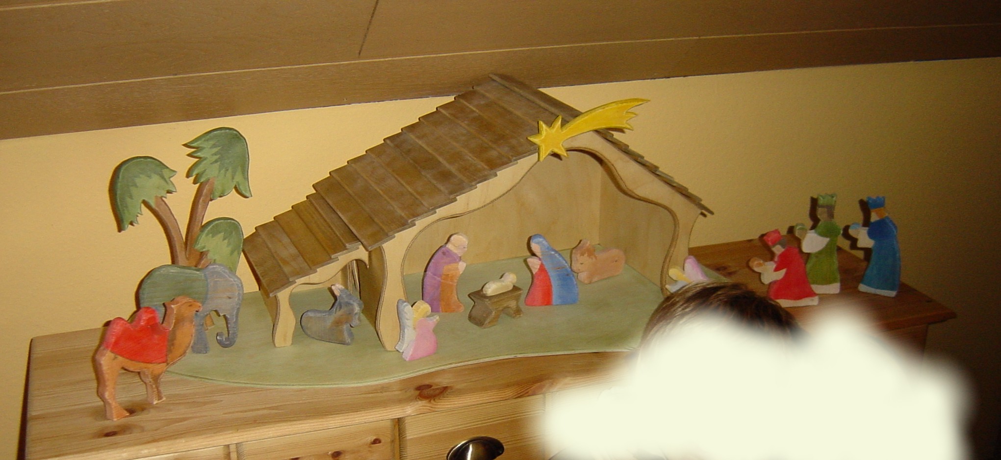 ohja das kenne ich... wenn man damit mal angefangen hat, mag man gar nicht damit aufhören... Hier mal ein Beispiel von mir. Mir gefällt die Weihnachtskrippe von "Ostheimer" so gut, sie ist nicht so kitschig wie die meisten aber dafür wahnsinnig teuer! Also habe ich im Internet nach den einzelnen Figuren geschaut und im Spielzeugladen nach dem Ostheimer Katalog gefragt. Daraus habe ich dann die Figuren (als Kopiervorlage) genommen, auf die Originalgröße kopiert. Ebenso mit der Krippe. Die ist auch selbstgemacht. Kostenpunkt im Original ca. 350 € unsere Kosten 50€.
