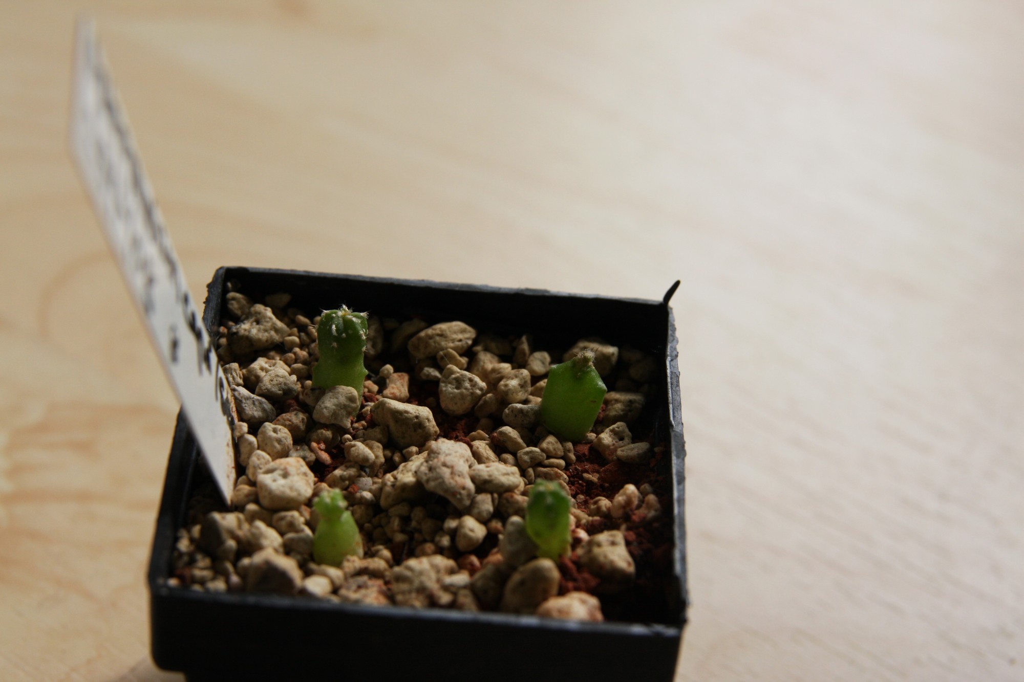 Substrat: Ziegelmehl + zerkleinertes Perlite + Spielsand + sehr wenig Kakteenerde (in Mikrowelle sterilisiert), Samen eingesteckt + mit abgekochtem Wasser angestaut