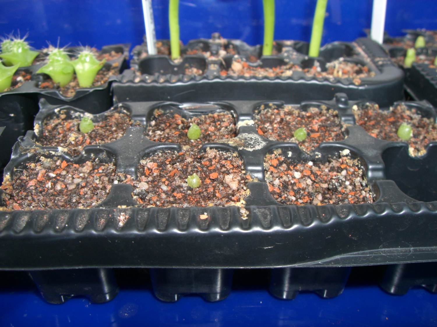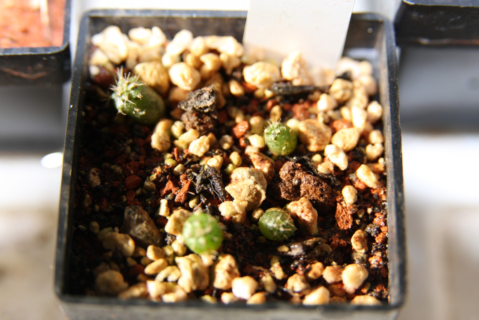 17.07.2008: Die kleinen wurden das erste Mal pikiert (je einer in einen Multitopfpalettenbereich) wg. beginnender Veralgung. Einer der Keimlinge war verfault & wurde entsorgt. Als Substrat hab ich sterilisiertes Ziegelmehl, zerkleinertes Perlite mit Minimalzusatz an Kakteenerde genommen – insgesamt ist das Substrat trockener als die Anzuchtmischung.
