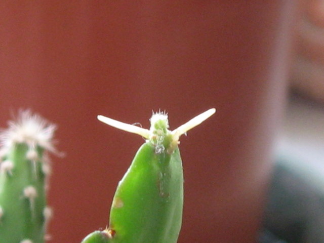 der stecki hat schön wurzeln gezogen in feuchtem sand. steht aber noch nicht in geeignetem substrat. jetzt kriegt er oben etwas. aber was? sieht aus wie wurzeln, aber warum denn da oben? wird das ein neues blatt oder ein blüte?
