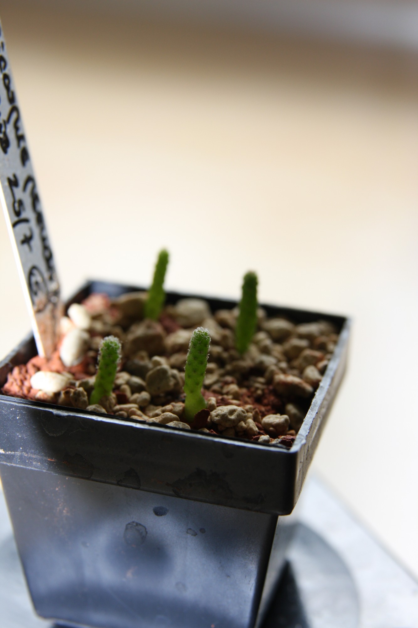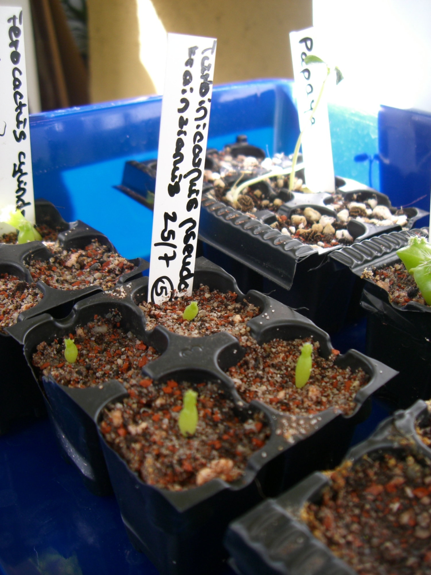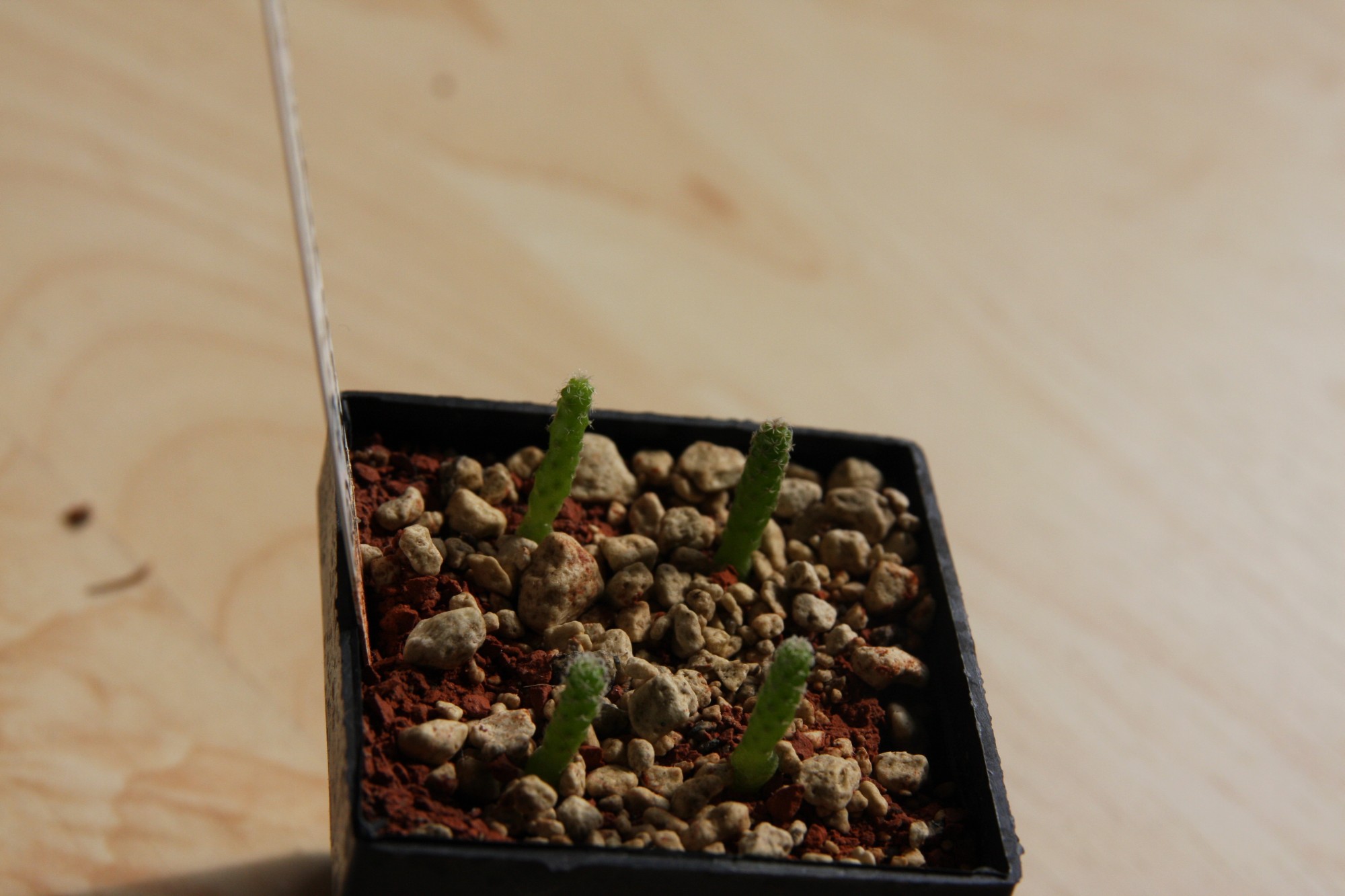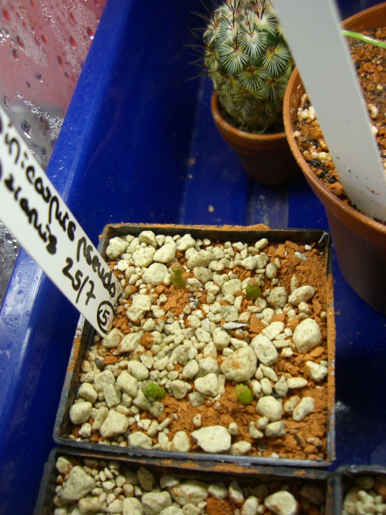 In der dunklen Jahreszeit werden die Sämlinge täglich 14h beleuchtet & stehen auf der Heizmatte, gegossen wird in immer unregelmäßigeren Abständen (ca. alle zwei Wochen) mit ganz normalen Leitungswasser was die Sämlinge soweit ganz gut vertragen, hin und wieder (einmal im Monat) wird ganz leicht mit Compo Kakteendünger gedüngt . Das Gießen erfolgt zuerst mit einer 10 ml Spritze damit die Sämlinge nicht weggeschwemmt werden, mittlerweile aber ganz normal mit der Gießkanne. Das neue Substrat, die Bodenwärme & das Licht tut ihnen sichtlich gut