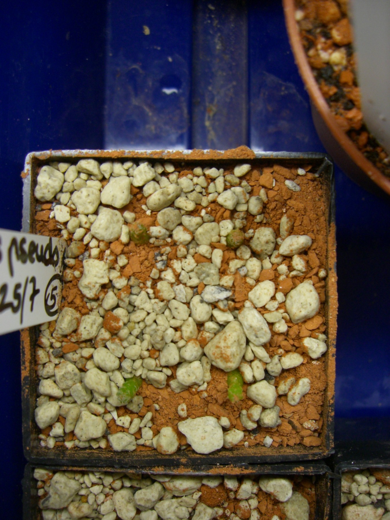 Substrat: Ziegelmehl + zerkleinertes Perlite + Spielsand + sehr wenig Kakteenerde (in Mikrowelle sterilisiert), Samen eingesteckt + mit abgekochtem Wasser angestaut