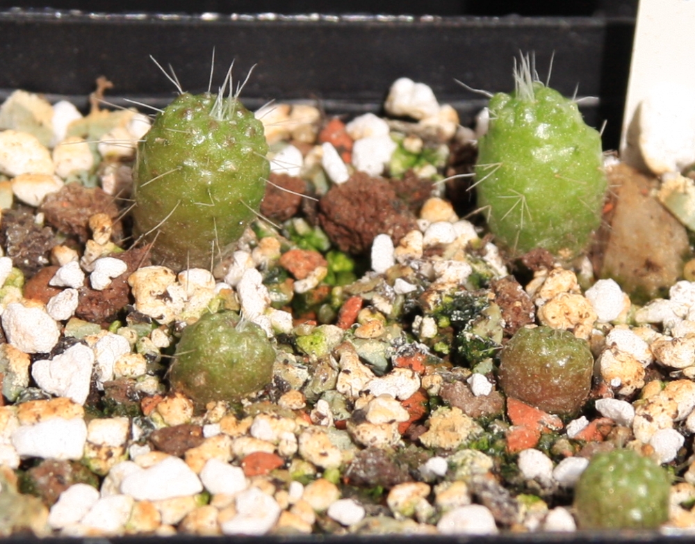 Die Sämlinge werden in ein Substratgemisch aus Kokohum, Perlite, Ziegelmehl und Bimskies (1:1:1:1) pikiert da das Ausgangssubstrat schon sehr verdichtet war. Das jetzt verwendete ist deutlich gröber als die Anzuchtmischung. Nach dem Pikieren wird eine Woche überhaupt nicht gegossen damit eventuell beschädigte Wurzeln nicht faulen. Mittlerweile sind sie so groß, dass man sie halbwegs gut fotografieren kann, allerdings sind es im Endeffekt immer noch Kugeln ohne Dornen (siehe Fotos)