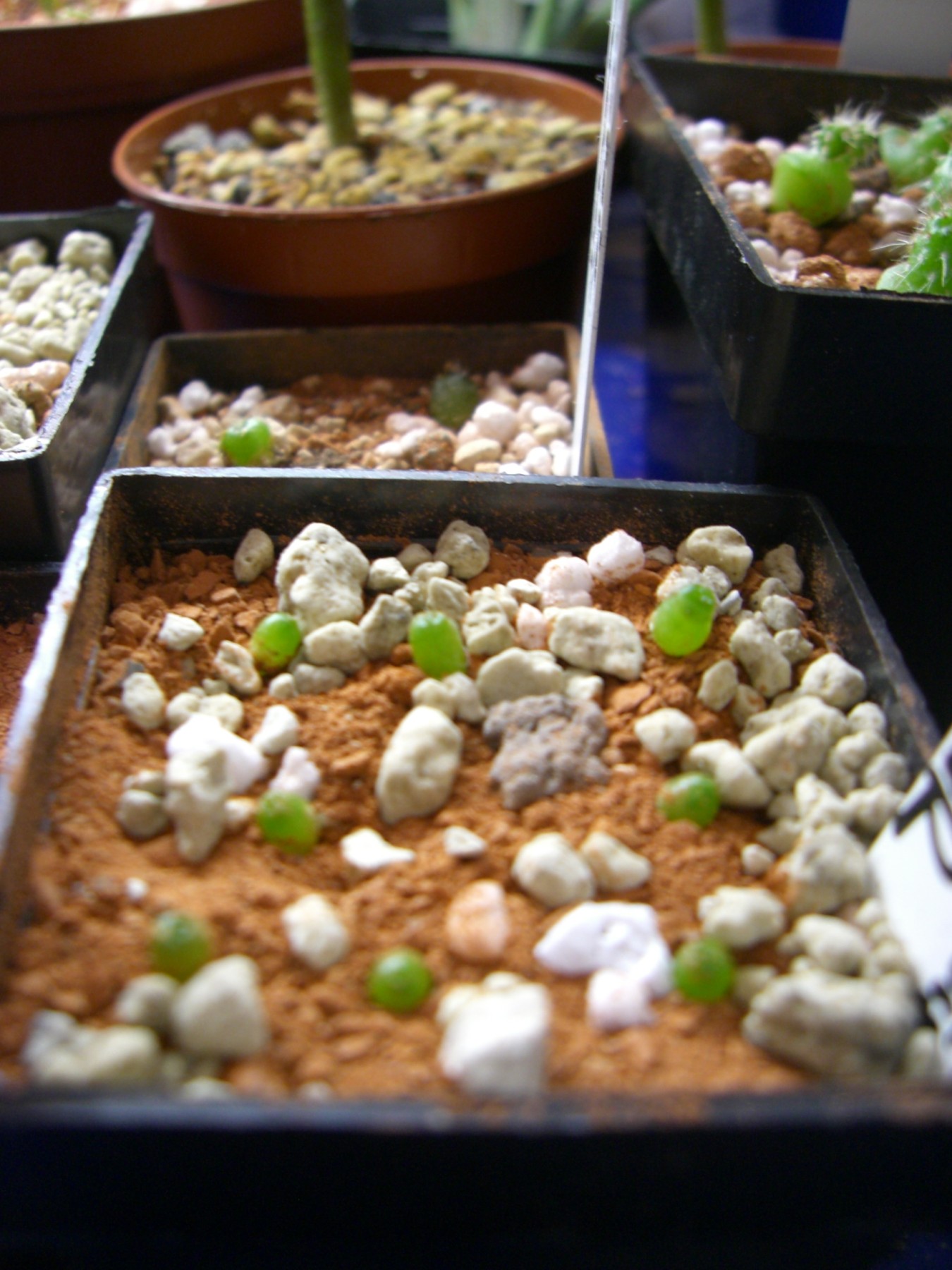 Substrat: Ziegelmehl + zerkleinertes Perlite + Spielsand + sehr wenig Kakteenerde (in Mikrowelle sterilisiert), Samen eingesteckt + mit abgekochtem Wasser angestaut