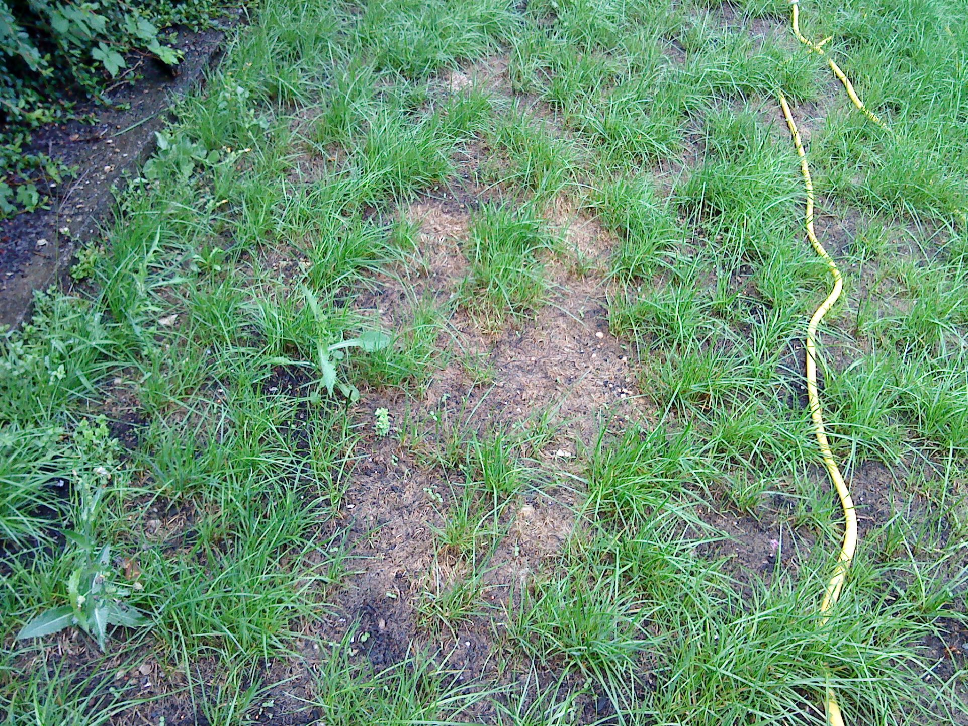 Es folgte eine kurze aber heftige Regenphase und da ging das Drama los: Auf dem Rasen bildeten sich "tote Flecken", d.h. die Halme waren einfach abgestorben. Jetzt sind da lauter braune Inseln auf der gesamten Fläche.