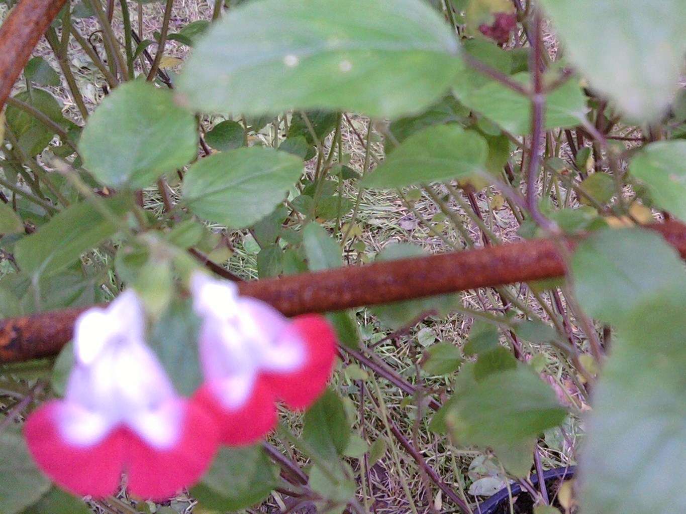 Ich habe Fotos gemacht, leider sind sie etwas unscharf. Ich finde die Blüte sehr interessant, ist mal was anderes. Auf der Hinterseite der Blüte ist ein kleiner Sporn, wie beim Elfelsporn zum Beispiel. Es ist eine Kletterpflanze, gehe ich mal von aus, zumindest war sie in einem Gerüst befestigt.
