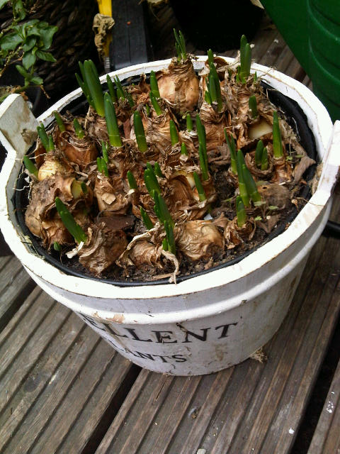 Ich habe Narzissen in einem Topf im Frühjahr gekauft und nach ihrer Blüte bis jetzt am Balkon stehen gelassen. Heute schaue ich sie mir an und stelle fest, dass alle angefangen haben zu sprießen!