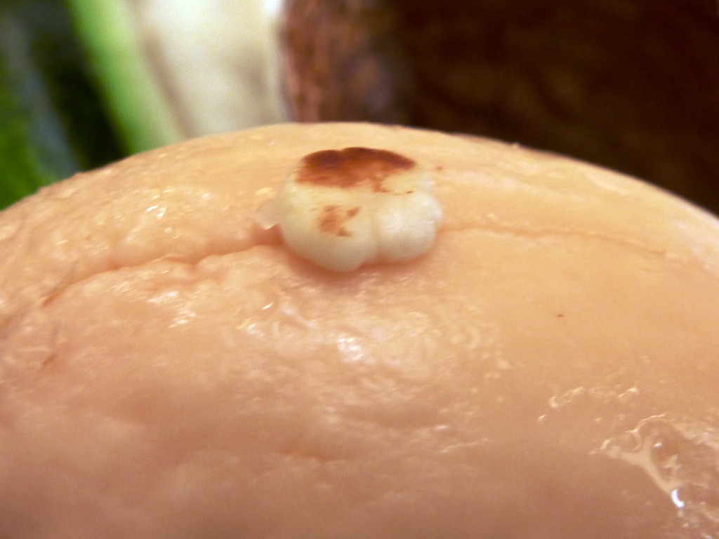 Kann man den Kern, wo sich die Haut von alleine gelöst hat, wohl so in die Erde stecken oder muss bei Avocados die Haut immer intakt sein? Diesen undefinierbaren "Huckel" auf dem Kern habe ich auch mal fotografiert (Nr. 2)
