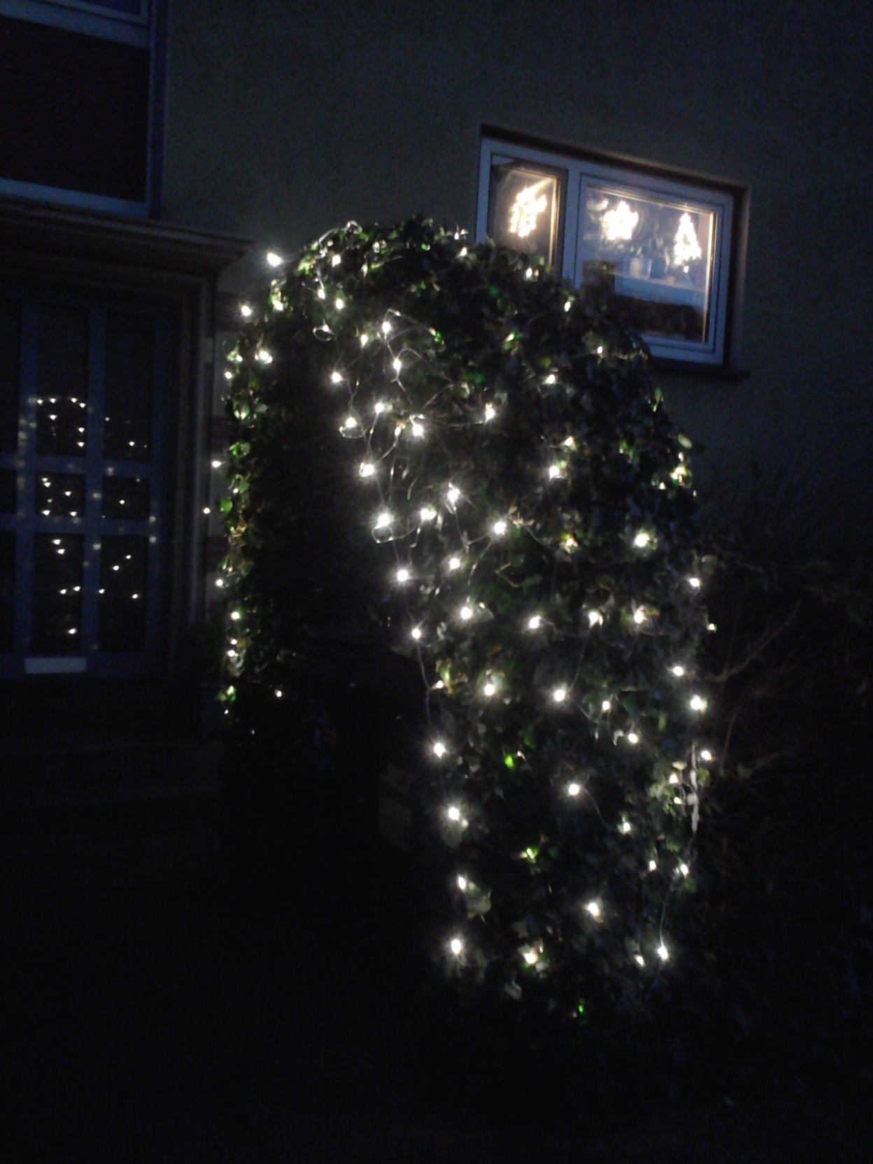 Wie gesagt, wir schaffen es fast nie, an die Lichterkette zu denken; es ist immer so viel anderes zu tun. Meistens denkt meine Mutter daran, wenn sie am 24. die Kerzen auf den Baum steckt: dann kommt plötzlich auch der Gedanke an die Lichterkette für draußen. Aber dann will auch keiner mehr das Ding suchen, sich durchs Gebüsch schlagen, und am Ende feststellen, daß man aufgrund eines akuten Mangels an Verlängerungskabeln jetzt wählen muß, ob man lieber draußen den Baum beleuchtet, oder drinnen den Raclette-Grill betreibt....