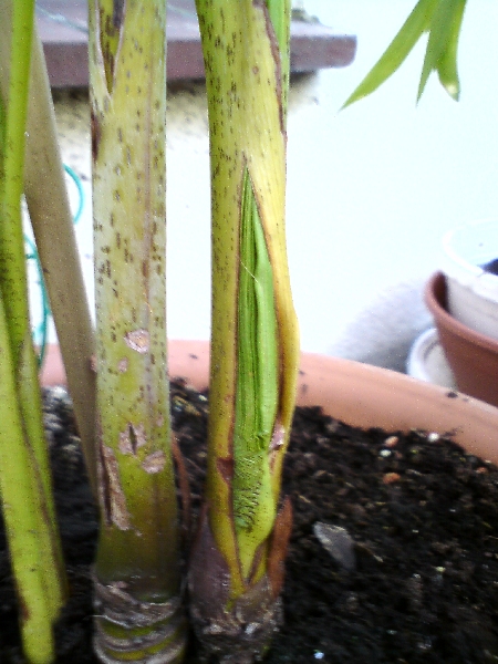 Aber nun habe ich eben an meiner kränkelnden, etwa 50 cm hohen Palme was entdeckt. Direkt aus dem Stamm, also nicht nebenan, oder aus dem Herzen (dort schiebt sie schon einen Wedel), schiebt sich ein Wedel hoch. Ich habe zum gucken auch mal ein Foto angehängt.