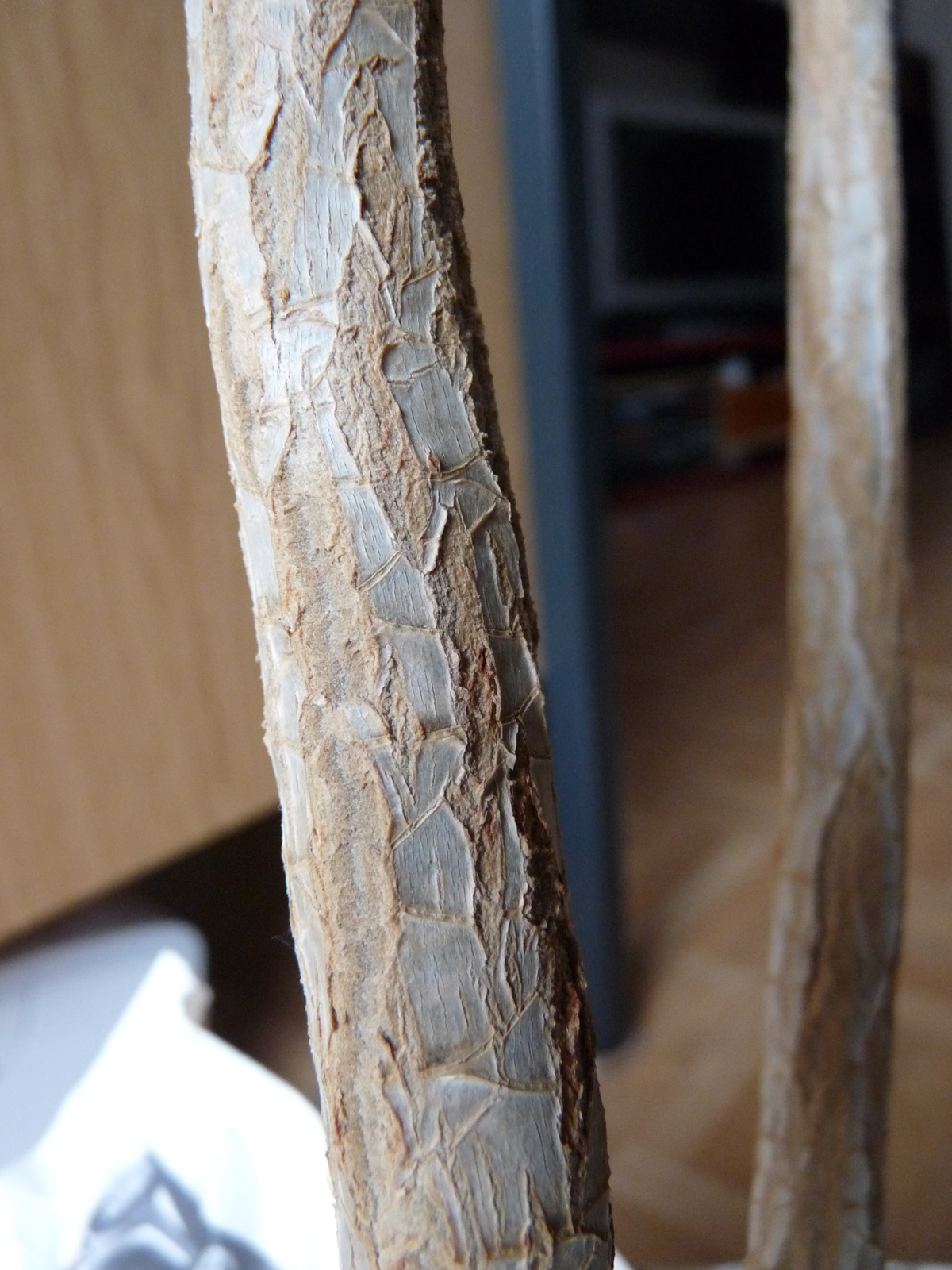 Ich stellte sie zunächst etwas heller (aber immer noch ungenügend) und habe sie wohl viel zu stark gewässert, beide Stämme verloren diesen Herbst schlagartig Blätter, das Substrat war klatschnass, sodass ich die Pflanze kurzerhand trockenlegte und (jetzt endlich) direkt vor das Schlafzimmerfenster stellte.