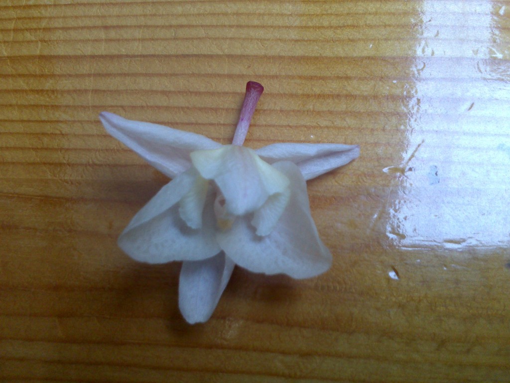 Die Blüten werden am Rand durchsichtig und verlieren immer mehr ihre Farbe (von zwei einzelnen Blüten an zwei unterschiedlichen Strängen abgesehen). Außerdem schrumpeln sie immer mehr zusammen und letztendlich fallen sie alle nacheinander ab, die Blätter sind aber alle saftig grün.