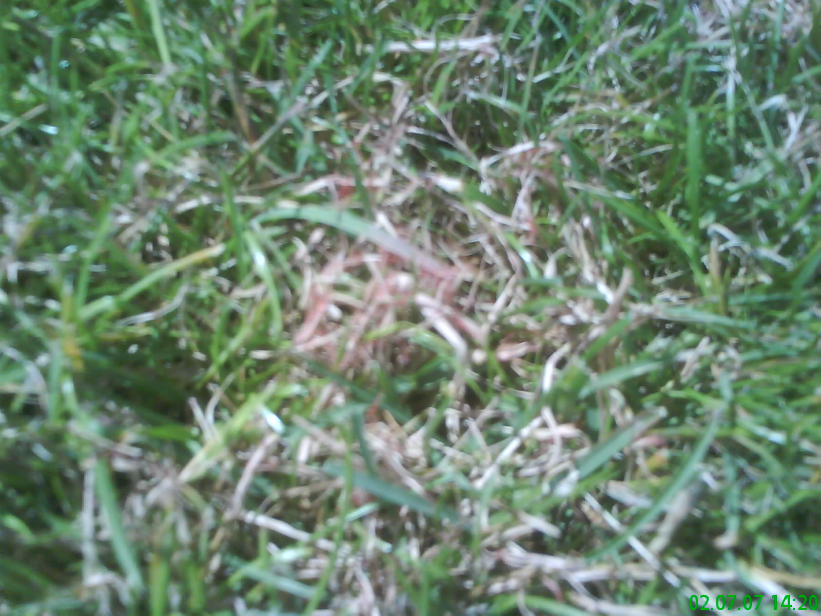 mein Rasen weist an manchen Stellen bräunlich, graue Flecken auf. Die Reste der Grashalme weisen am oberen Ende rote Spitzen auf.