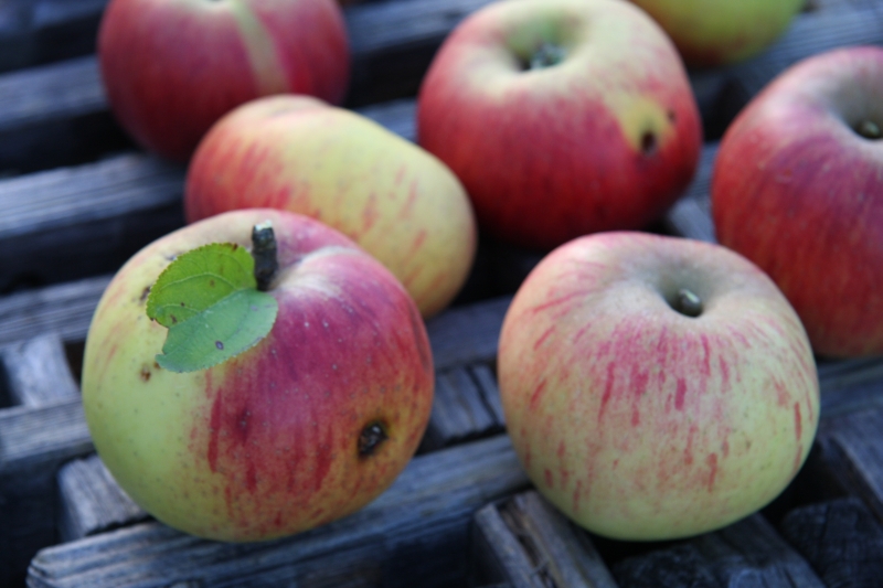 Der große Baum ist sicher min. 40 Jahre alt. Die Äpfel werden recht schnell gelb-rot(also das grünliche wird gelber) und sind ziemlich säuerlich.