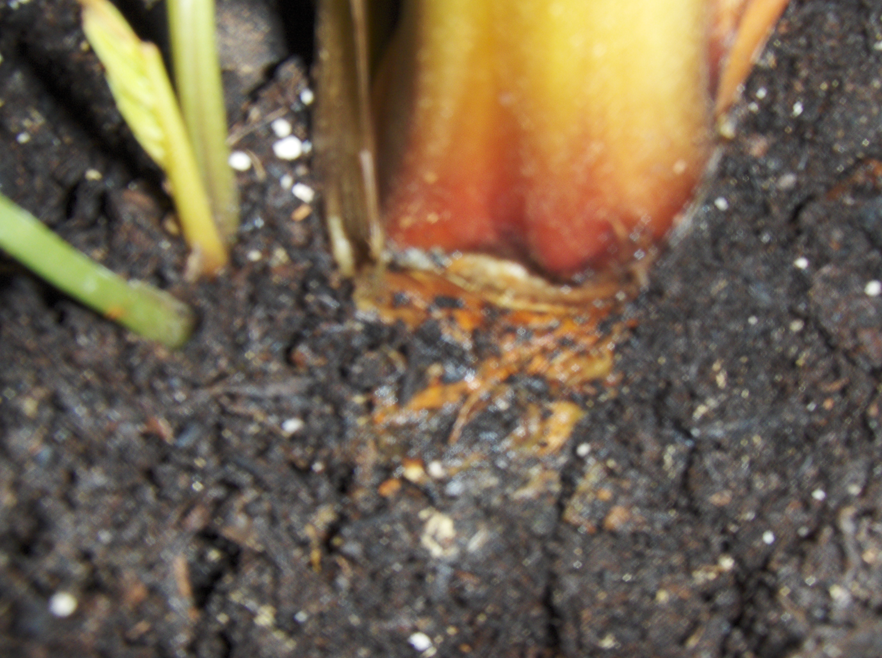 Jetzt hab ich mal die Erde ein bisschen weggemacht an der Stelle und da riechts genauso und es ist auch so rötliches glibberzeug da