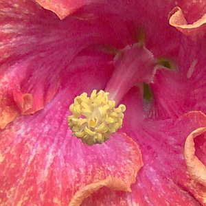 Heute wollte ich versuchen, meinen rosa Zimmerhibiskus zu bestäuben. Doch trotz allen Suchens habe ich keinen Stempel gefunden .