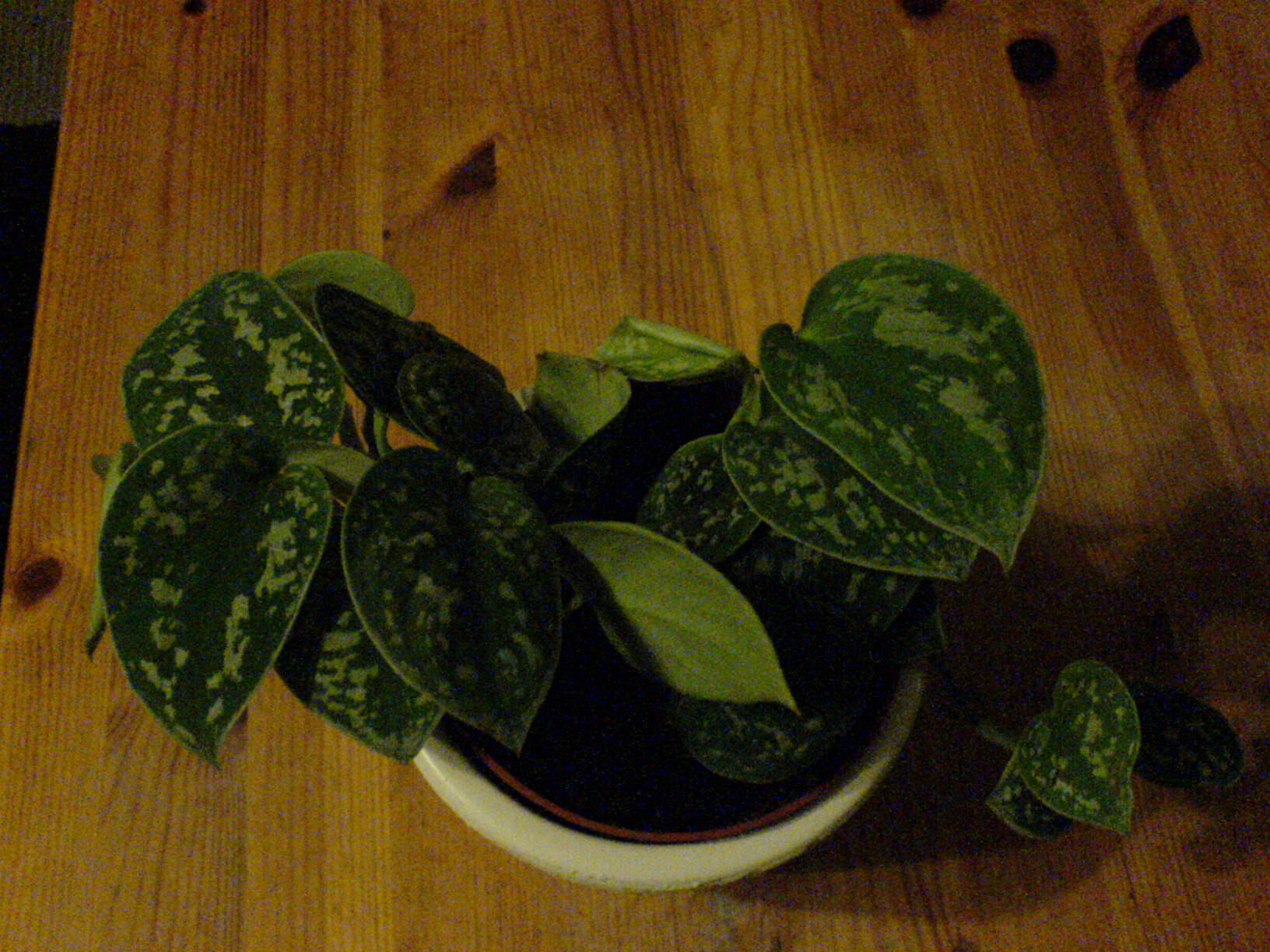 Was mich etwas wundert an dem guten Stück: auf dem Topf steht "Epiprenum Aureum", aber ich kenne die Efeutute eigentlich nur mit glatten Blättern, und diese hier sieht aus wie Nicki-Stoff und fasst sich auch recht kuschelig an! *koppkratz* Die hellen Flecken wirken übrigens fast silber... noch ein bisschen mehr Licht von der Seite und man könnt' meinen, die reflektieren wie diese Warn-Streifen...