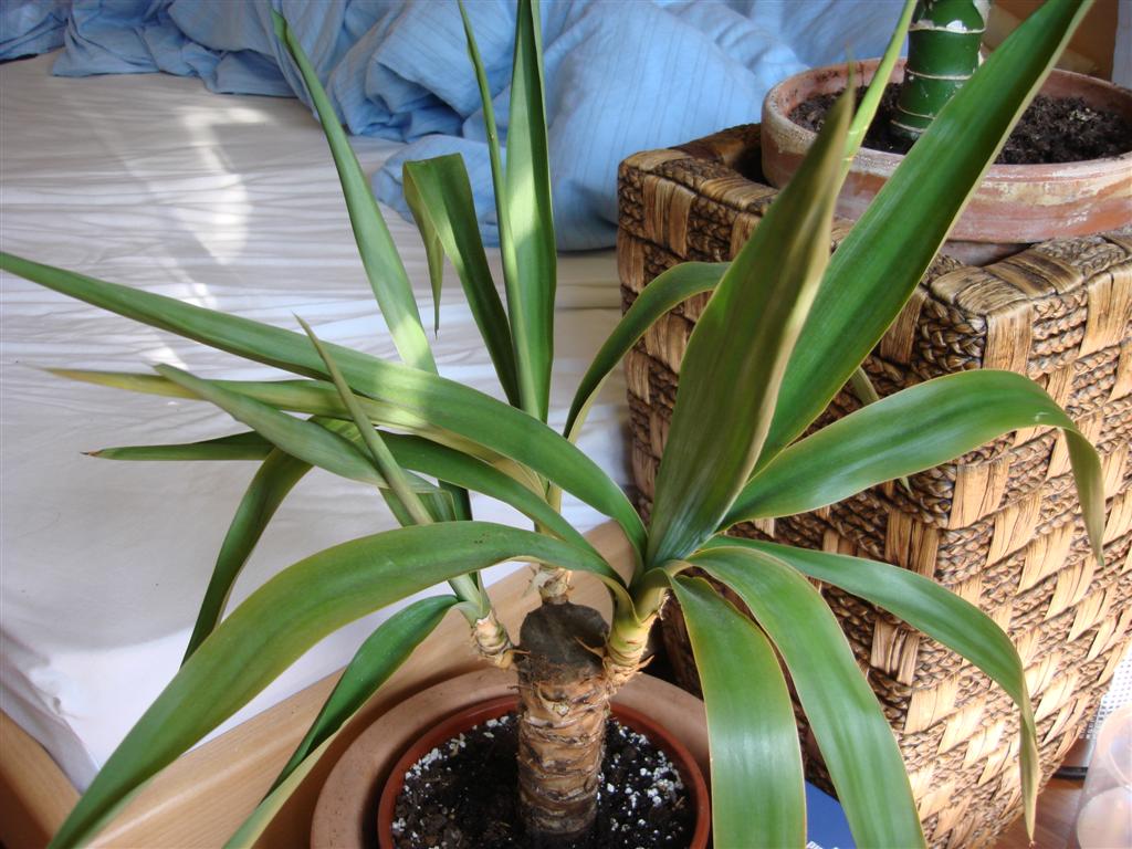 ich hab ein Problem mit einer meiner Yuccas und zwar wächst sie irgendwie gar nicht mehr (schon eine halbe Ewigkeit) und die Blätter sind von unter her immer heller und lascher geworden. Die oberen Blätter rollen sich irgendwie auch etwas ein. Aber seht selbst.