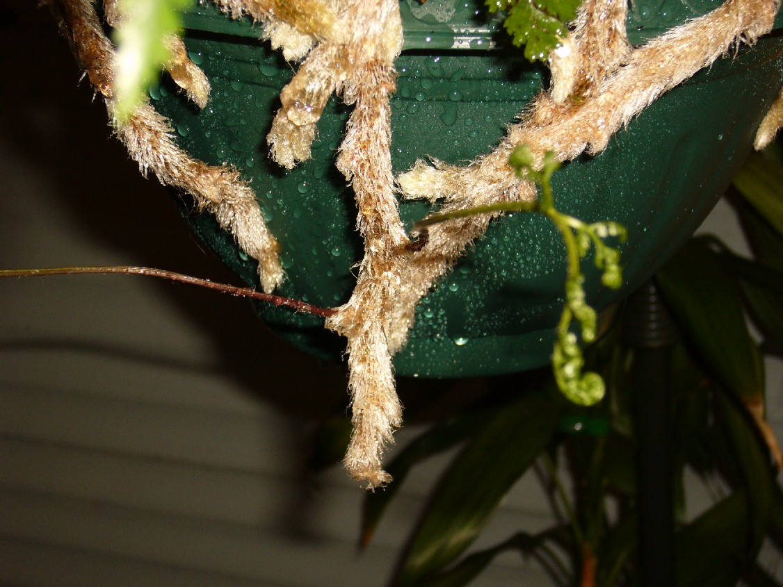 Also - wir haben den Farn jetzt so ca. 14 Tage. Aus dem Topf wachsen so Puschels raus.
