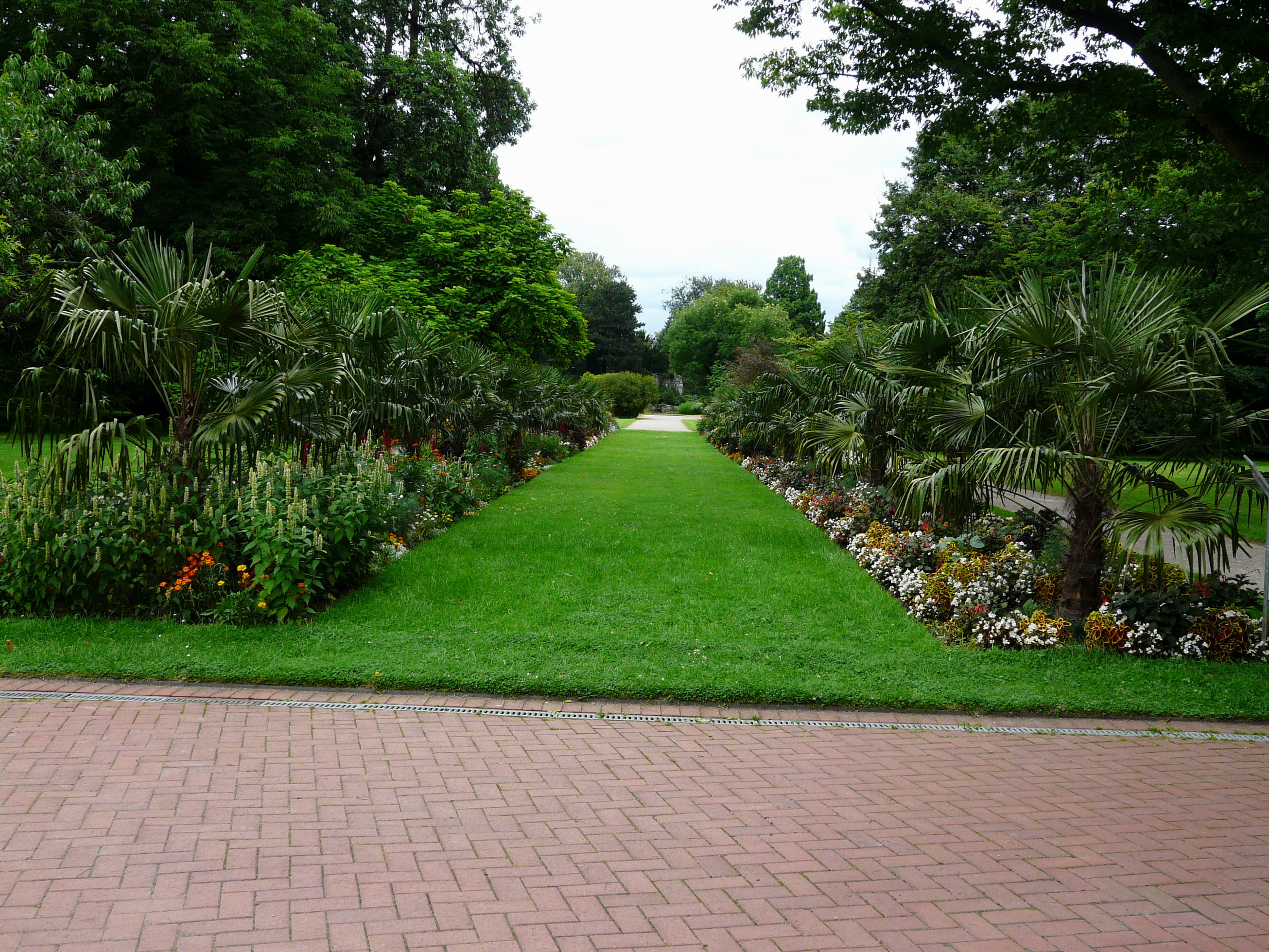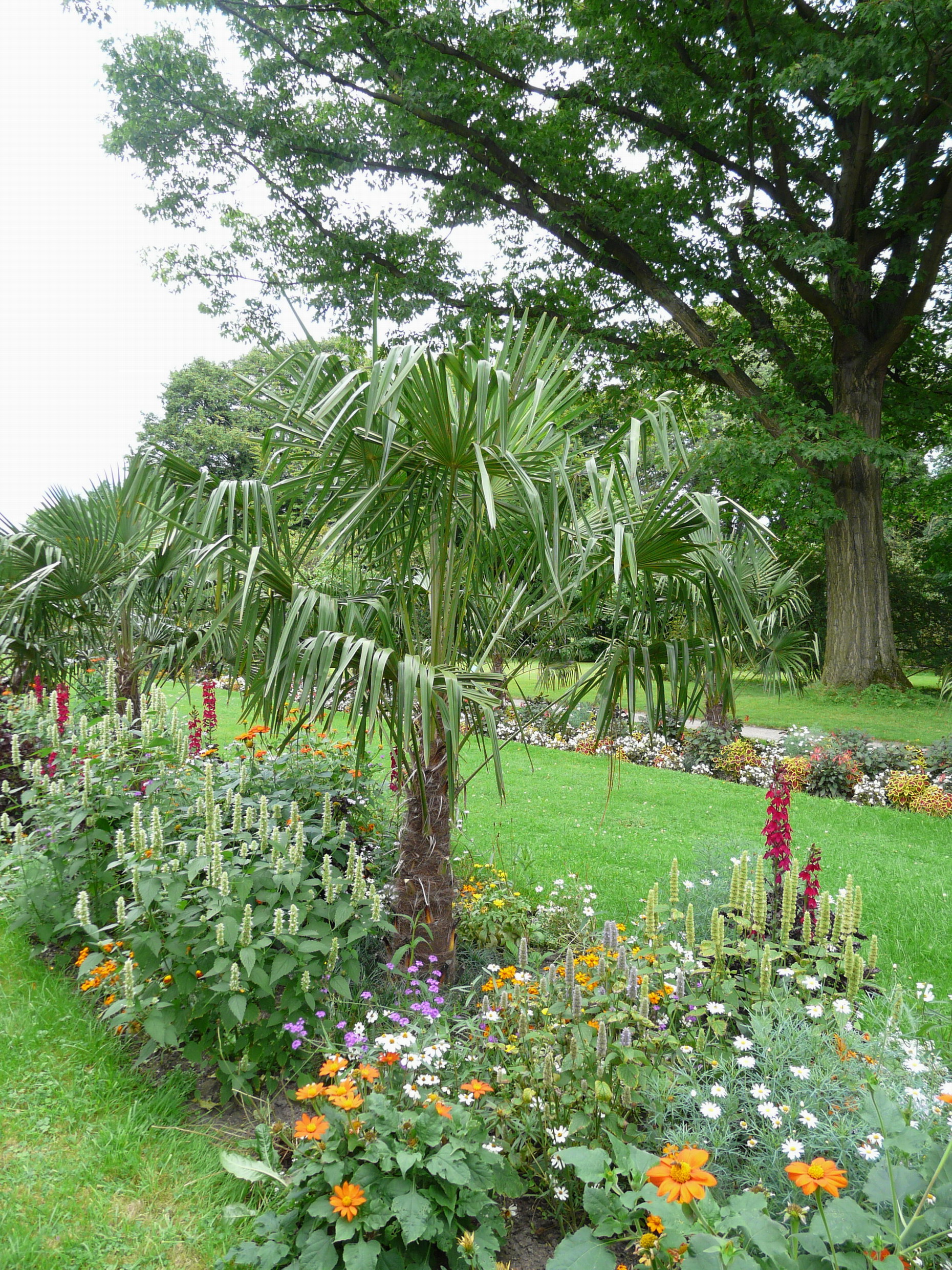 Zusammen mit der reichblütigen Unterbepflanzung im Stil des „Mille Fleurs“ entsteht eine heitere, südländische Urlaubsatmosphäre, die in der Flora, dem Botanischen Garten Köln, zum Wandeln unter Wedeln einlädt.