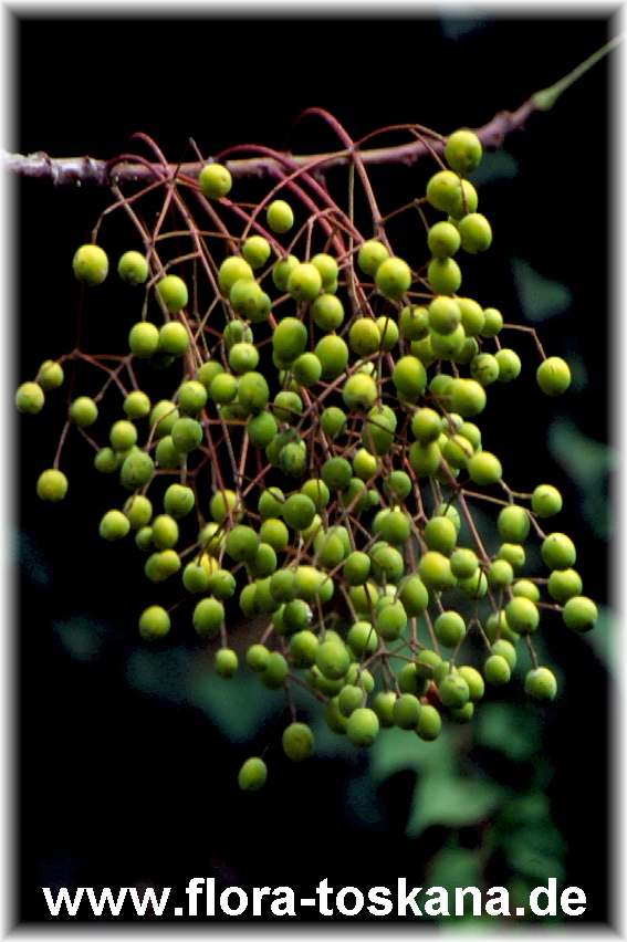 Hinweise: Paternosterbäume sind ausgesprochen genügsame Kübelpflanzen, die auch Pflegefehler nicht übel nehmen. In kalten Wintergärten ist er ein wertvoller, sommerlicher Schattenspender, der im Winter das Licht hereinlässt. Der Name rührt von den harten Samen her, die man früher zu Rosenkränzen verarbeitete.