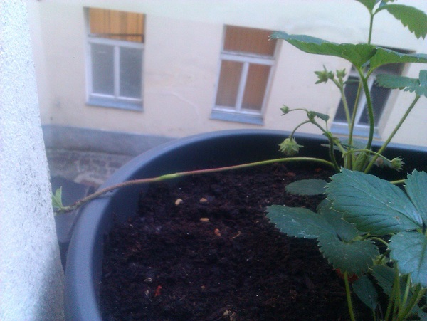 Meine Erdbeerpflanze (eine von vielen) schickt gerade so eine Ranke quer durch den Blumenkasten...