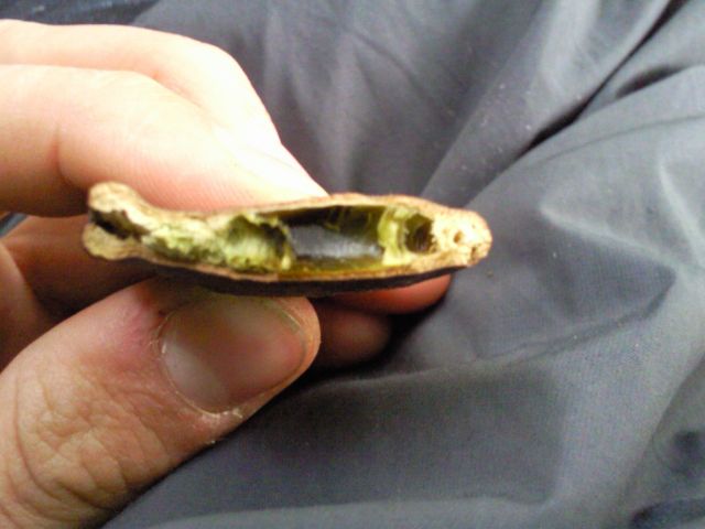 Ich habe eine dieser schoten geöffnet, aber da drinn ist nur eine klebrige, zähe masse und keine kleinen böhnchen.