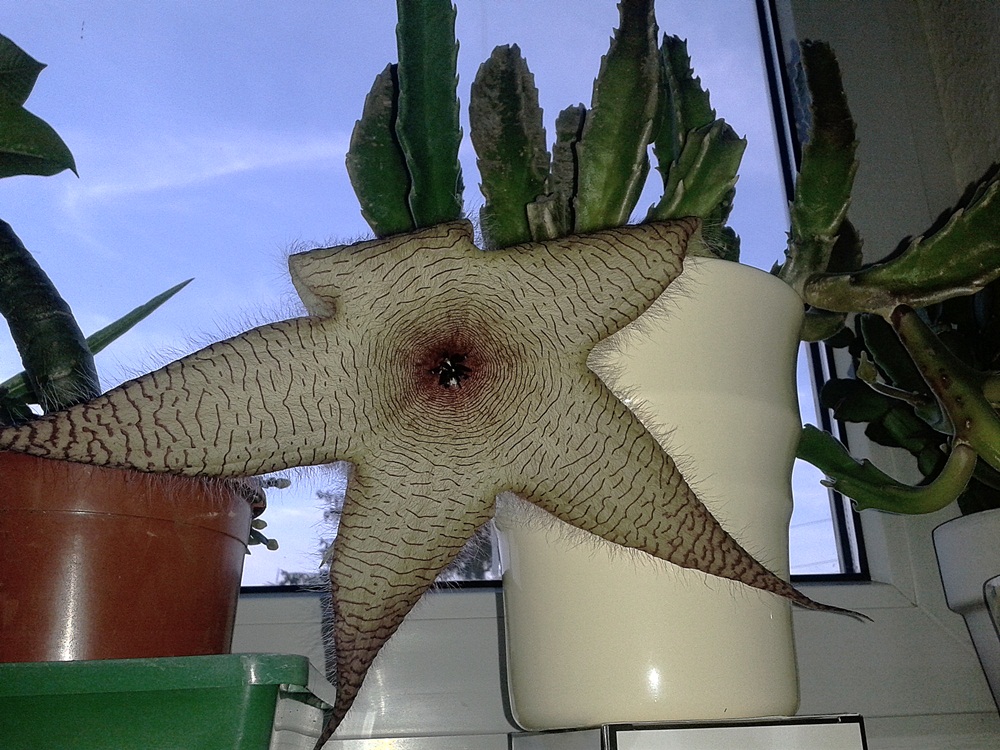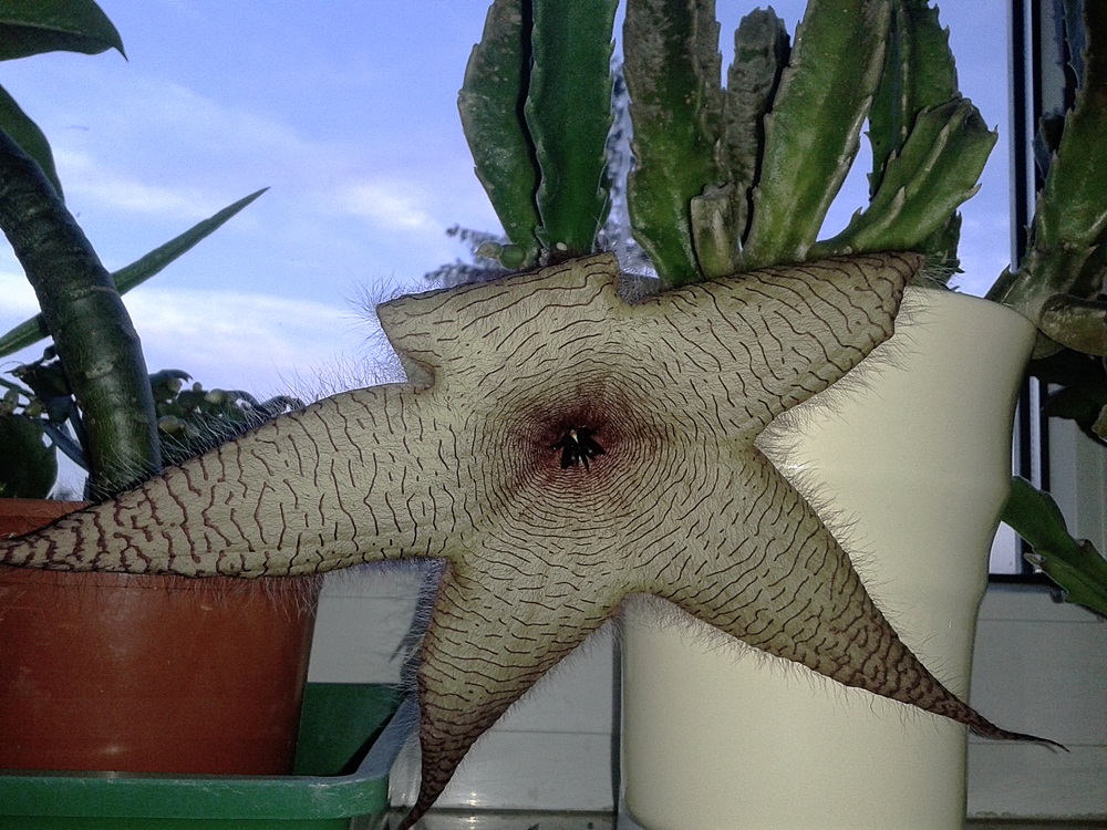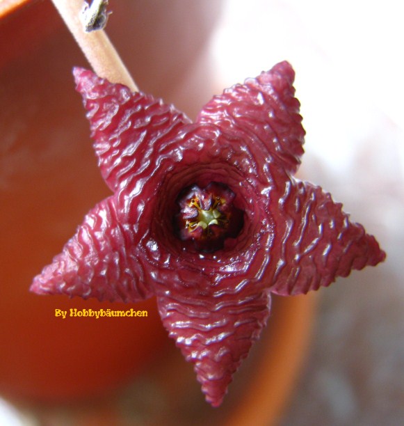 Habe mir eine Stapelia gariepensis, auch Katzenpo-Pflanze genannt (die blüten sehen irgendwie so aus ) gegönnt, leider war die Blüte schon verblüht. Man kann trotzdem ihre Schönheit noch gut erkennen.