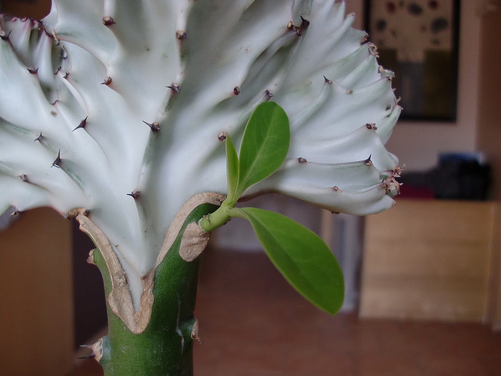 Seit letztem Sommer wohnt bei uns eine Euphorbia lactea cristata (wir fanden das Teil skurril und haben es deshalb mitgenommen). Im Winter zeigte sich irgendwann ein kleiner Gnubbel am Stamm, der sich inzwischen zu einem kleinen Stämmchen mit Blättern entwickelt hat. Nur was ist das (ein Ableger?) und was mache ich damit?