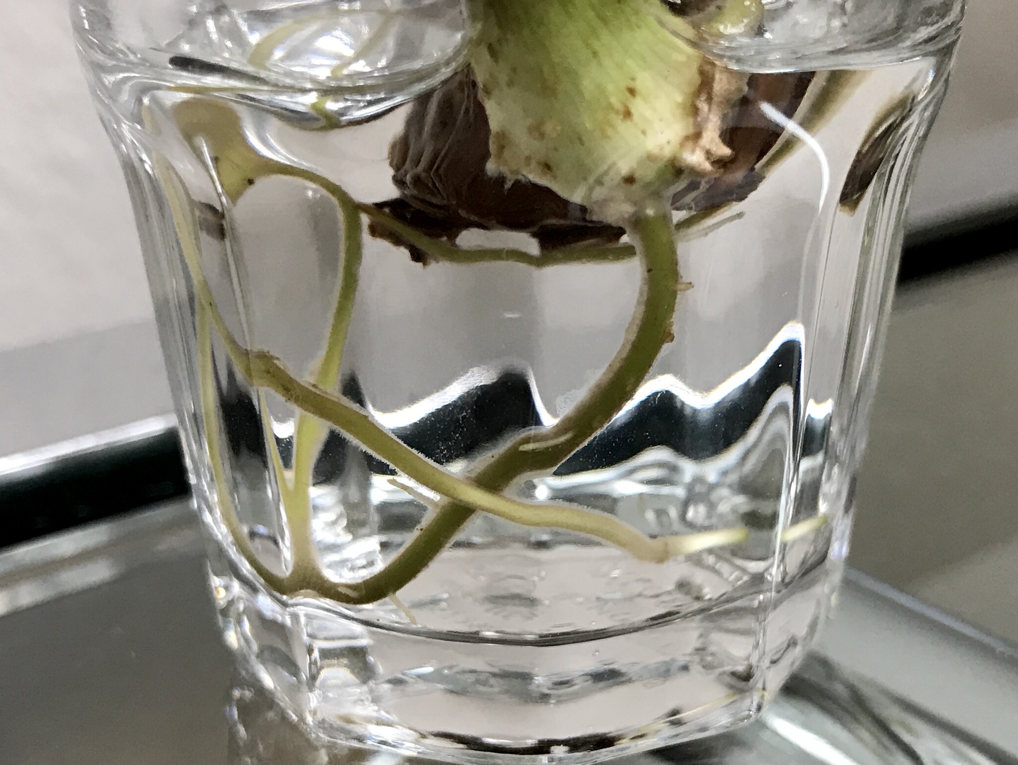 Ich würde mal das braune Blatt abschneiden, das ist endgültig kaputt. Ich weiß echt nicht, ob das Schimmel ist. Weißer Schimmel im Wasser kommt mir ungewöhnlich vor. Ich finde es sieht so aus, als wächst das was.