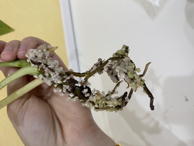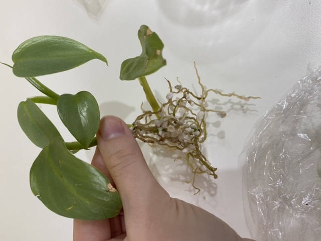 Die Wurzeln sind schon relativ groß, aber das Syngonium bekommt schlaffe hellgrüne Blätter, glaube es hat im Perlit dann irgendwelche Probleme bekommen.